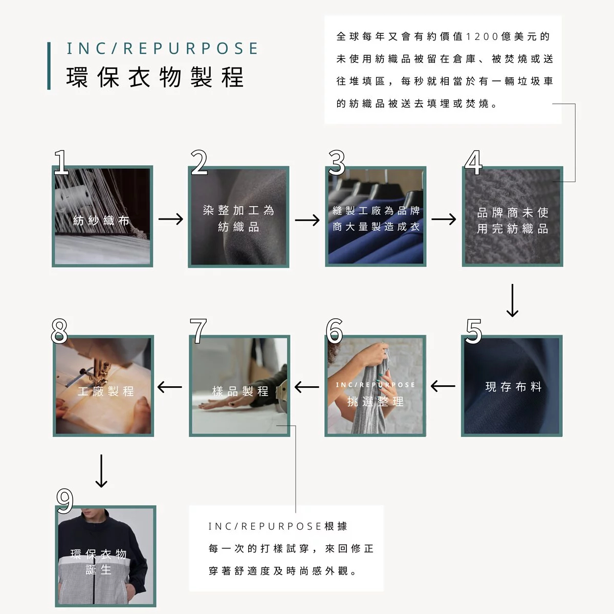 由澳洲華裔設計師帶領的INC/REPURPOSE團隊從台灣發跡,決定從零廢棄的「循環時尚」開始,讓布料再利用,實現時尚環保與生活美學的共感設計,運用現有資源進行再創作,重新賦予它們新生命。