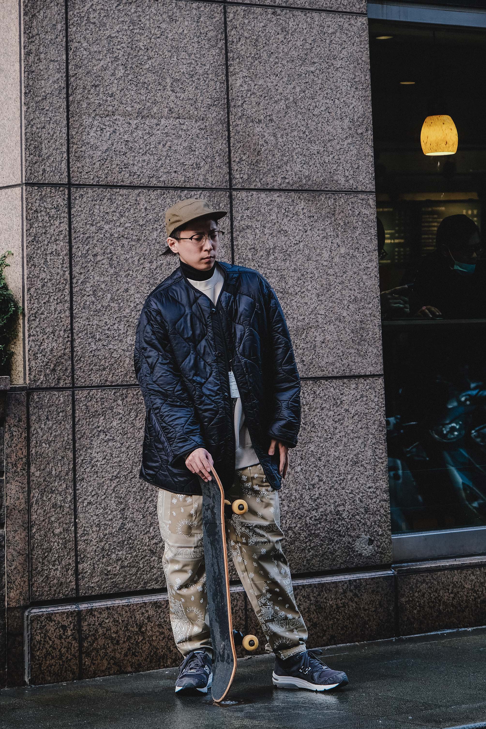 男生則是以絎縫外套為整體造型重點,再搭配大學T及圖騰主廚褲。絎縫外套最早作為軍裝大衣裡的保暖內裡,到現代則延伸出許多版本,尤其是日本近年超級流行!FREAK’S STORE這款具備蓄暖等機能性,男女生都適合。
