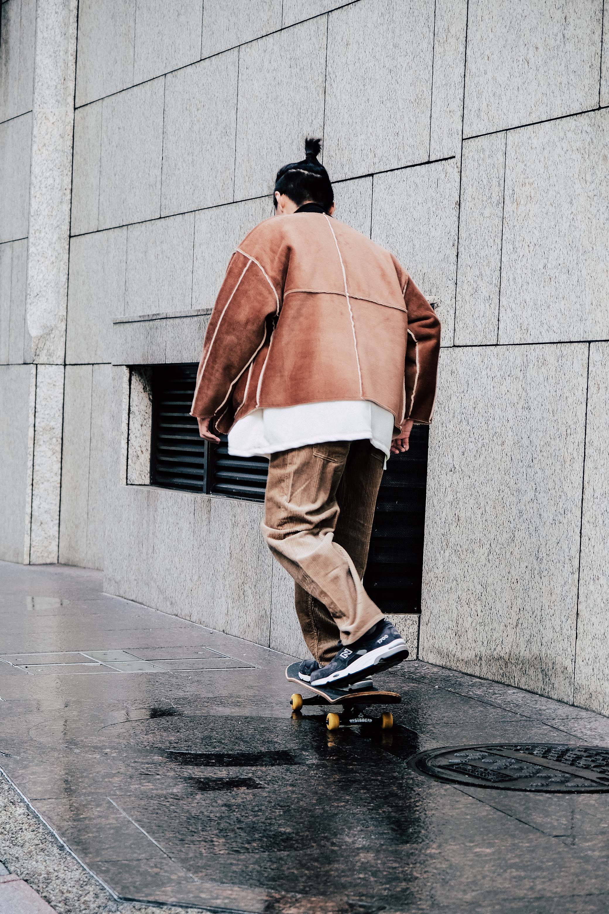男生同樣著用了同系列的短版燈芯絨外套,下身穿同色系的燈芯絨寬褲來呼應上身,化身滑板男孩,營造City Boy風格。