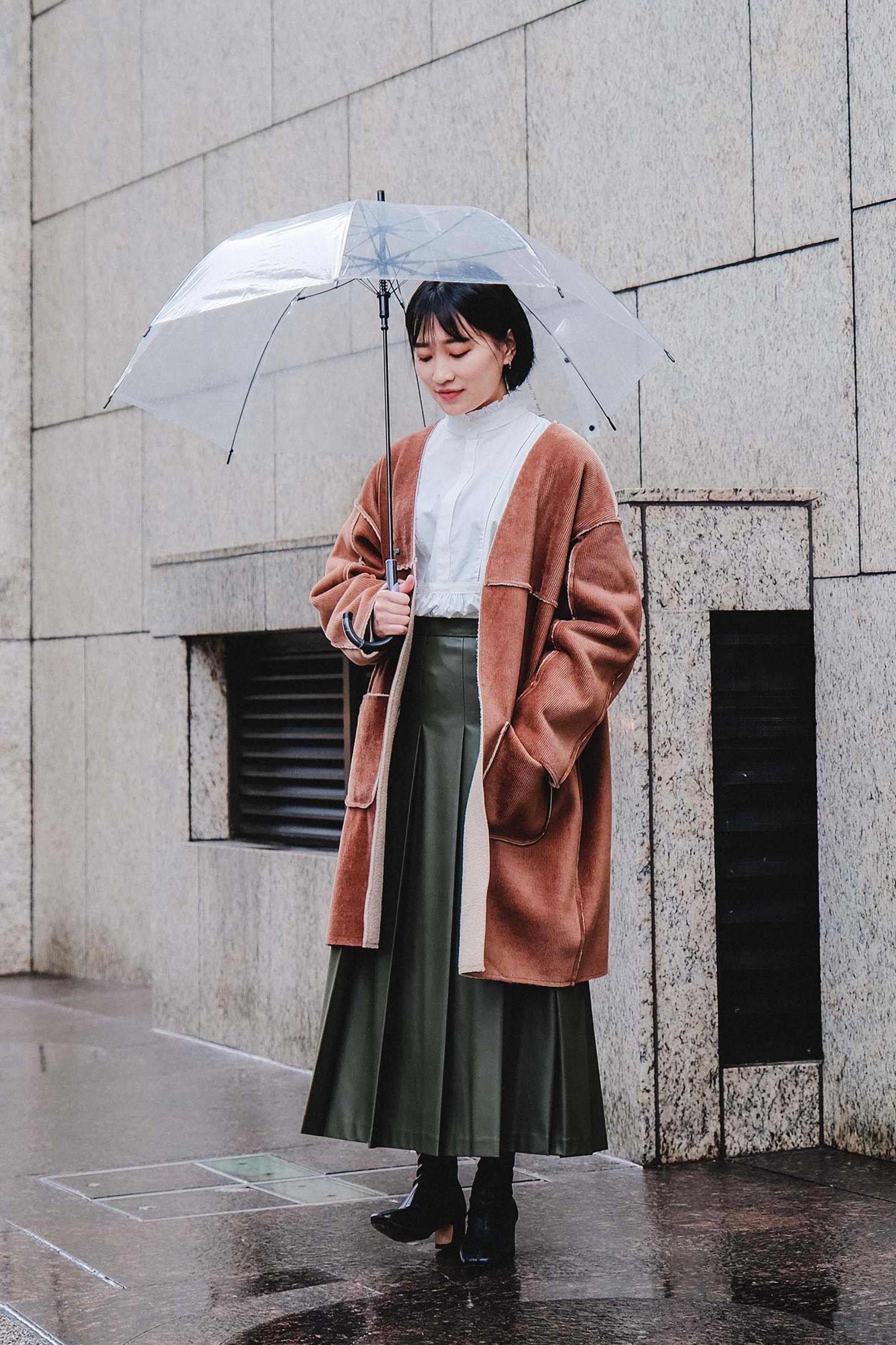 美式復古風常見的燈芯絨,也是秋冬定番材質!這兩件燈芯絨外套雖然是女裝尺寸,但男生穿也不成問題!女生上身穿上荷葉邊襯衫,搭配橄欖綠的寬百褶皮質裙,高腰的剪裁修飾整體比例。
