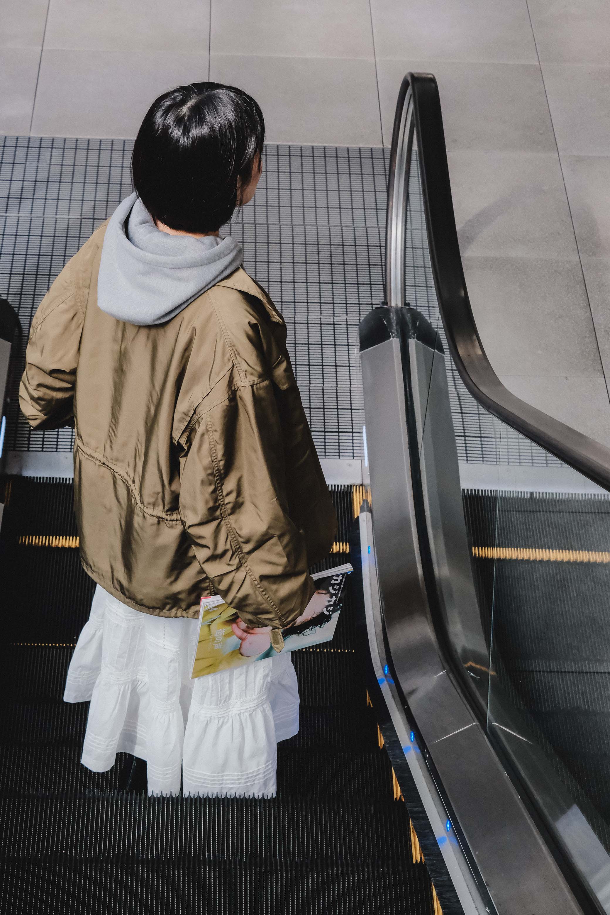 第三套則是大勢的軍裝系列!女生著用男款M65軍裝外套,是帶有微微光澤的滑料材質,寬鬆的尺寸恰到好處,裡面再搭配帽T,穿出冬日特有的休閒感,下身以日系風的蕾絲層次長裙混搭出帥氣甜美風格。