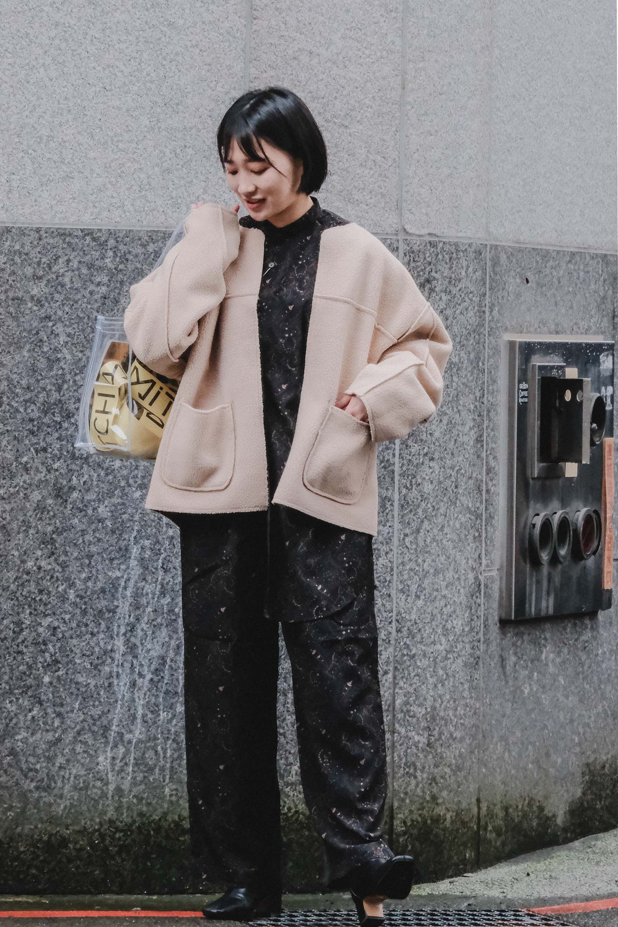 最後一套則是這幾年超流行的變形蟲圖騰元素,也有人叫它腰果花、佩斯利,FREAK’S STORE的定番花色。女生穿上整套深色系花紋套裝,外搭則選擇了可以兩面穿的燈芯絨外套,另一面是像羔羊毛般的絨毛質地,來中和整體的深色造型。