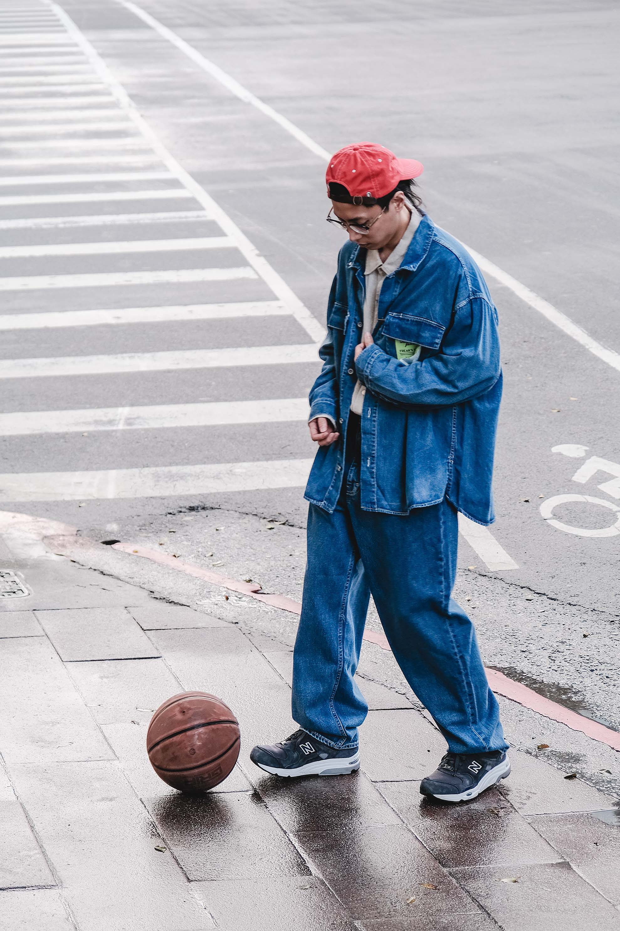 男生同樣也是全套丹寧風格。經典的CPO襯衫外套搭配ECO落地氣球褲,寬鬆OVERSIZED路線,口袋前的螢光色紙標雖可取下,但也推薦放著作為小亮點,並以復古紅色老帽點綴整體。