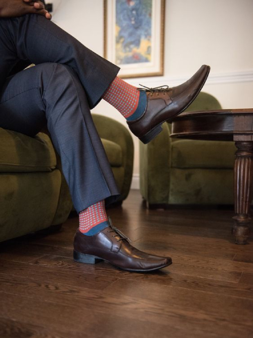 在一身沉穩色調的西裝中,加入菱紋、格紋或是點點花樣的中長筒襪也是不錯的選擇,大膽配色為腳部增加亮點!