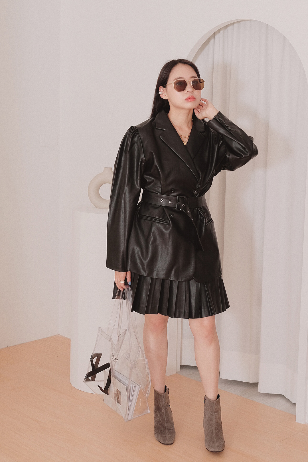例如這套上身皮夾克和超浮誇澎袖搭配露出腿部的短裙,即便上身較為厚重,也能讓身形有存在感,不至於掩沒於服裝當中~