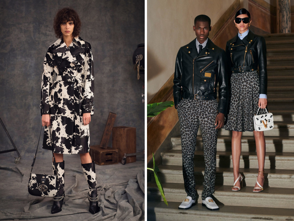 過去常出現在手袋包款等配件上的斑馬紋、豹紋、蟒蛇紋等,現在逐漸被運用在服裝上,並伴隨著金屬色紗線、植絨與色彩的加入打造抽象設計。像是Michael Kors就用了許多乳牛、黑白的印花在大衣、皮草、洋裝上;而Versace則是改以較浪漫的手法,將動物元素分開放在如裙裝、襯衫、外套等單品上,適合想嘗試看看的入門穿搭者。