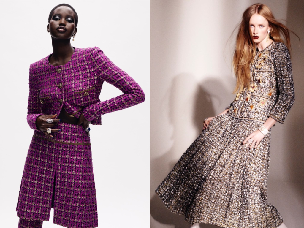 高端花呢和裝飾性花式紗線成為新的秋季編織外觀平紋針織結構,毛圈花式線、金屬色與段染效果以中至粗針距質地呈現。 像是CHANEL高級訂製服便在20/21 AW重新演繹了斜紋軟呢,優雅洗鍊並展現華美亮麗細節。