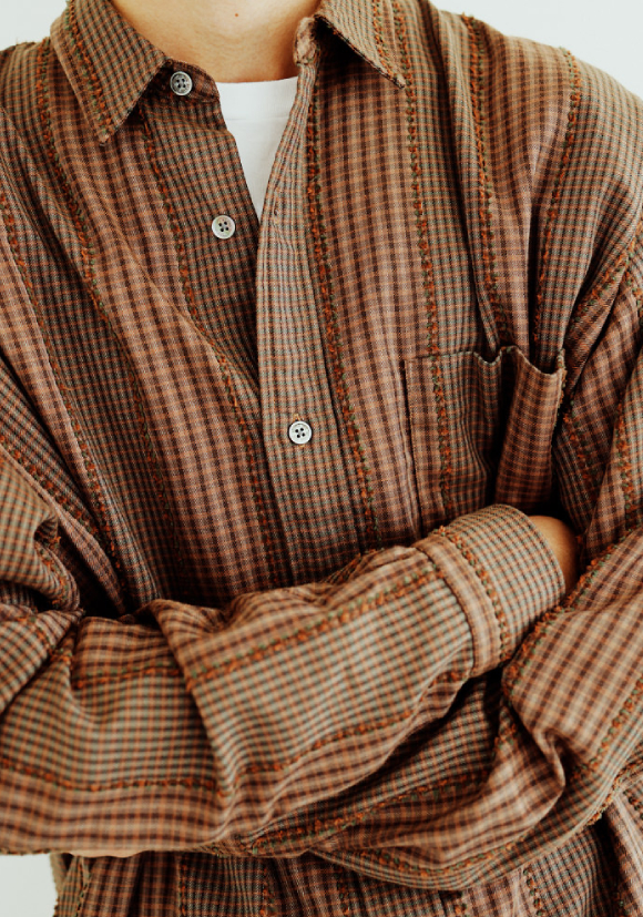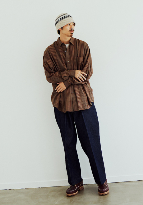 緹花起絨材質的格紋襯衫,帶有凹凸感的布料,整體呈現復古氛圍,版型寬鬆卻十分俐落。下身搭配輕磅的丹寧長褲,經過水洗加工及寬鬆的分量感,彷彿工作褲般的絕佳版型,錐形及中央摺線設計又增添了一份正式感。除了定番的帆船鞋外,搭配球鞋也可以有街頭感!