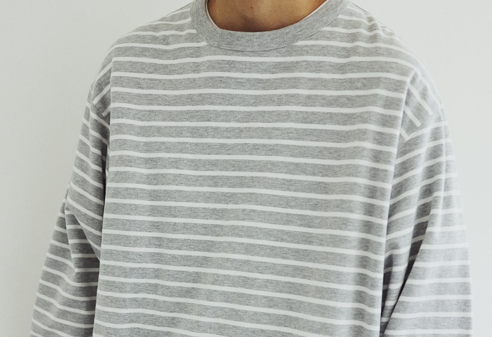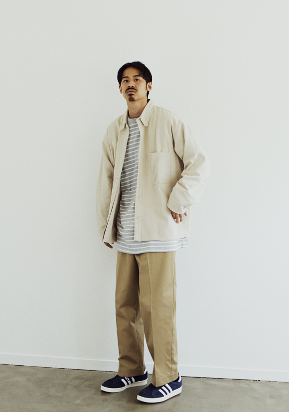 給人簡潔印象的同色系穿搭!下身同樣著用具有高雅質感BEIGE工裝長褲,搭配米白色的厚磅襯衫,領子及口袋的不收邊的破壞抽鬚加工為一大設計亮點,每件單品都細藏著BEAMS的巧思!內搭灰色條紋上衣,天竺棉材質提供最舒適的穿著體驗,重點還可以雙面穿!