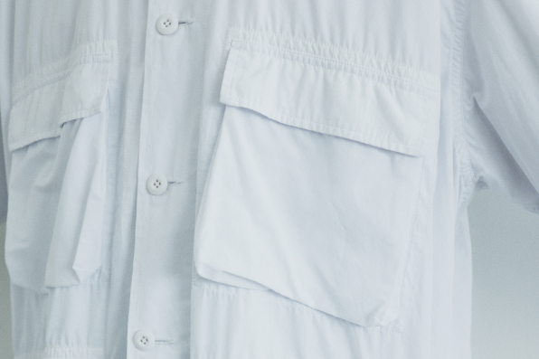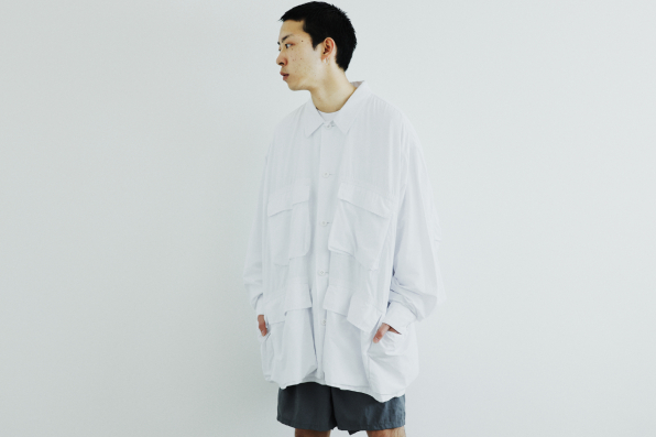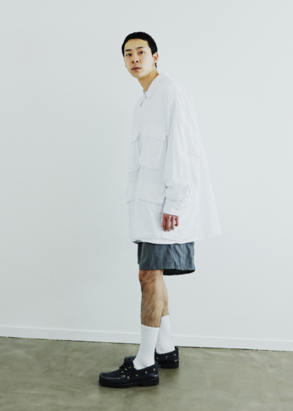 由美軍BDU外套為靈感的襯衫式外套,BDU是BATTLE DRESS UNIFORM,俗稱作戰服,具有四個箱式大口袋設計。採用常見的襯衫輕薄材質,卻不易皺,整體輕巧俐落穿脫方便,不會因為是軍裝設計而給人過於生硬粗獷的印象。超寬鬆的現代版型設計,可以再內搭襯衫營造層次感,和任何類型的褲子都很百搭,STYLE B系列搭配工裝短褲,與白色長襪 X 帆船鞋的紳裝風格完美融合。