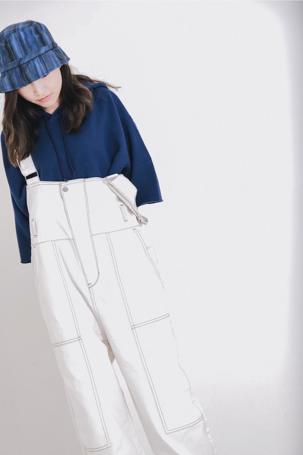 充滿男孩風格的經典短袖帽T,袖口處採不收邊設計,鮮豔飽滿的色系讓人眼睛為之一亮!ONE SIZE的工作吊帶褲採用厚實的丹寧布料,可調節長度及鬆緊度,不論男女都可著用,車縫線細節為造型增添豐富感。