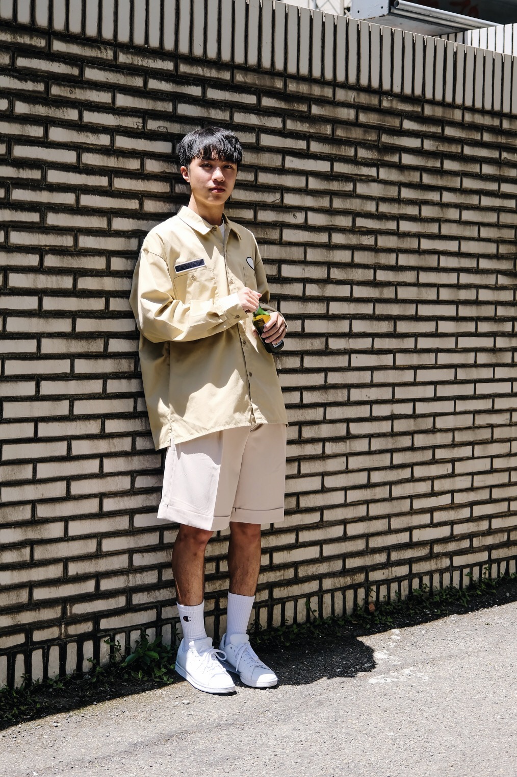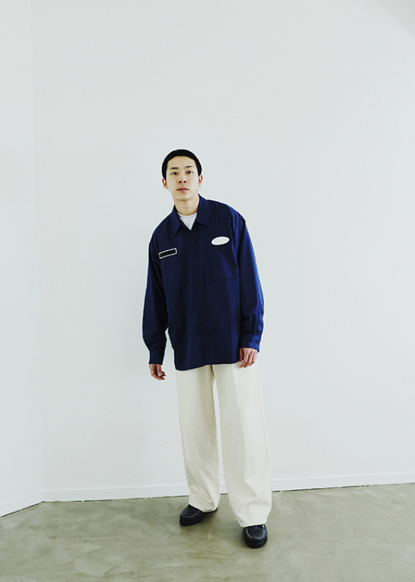 以胸前兩處徽章布標作為亮點的工作襯衫,光這件就超有型!休閒卻不失街頭感。質料硬挺,版型寬鬆,當襯衫或外套都很OK。並內搭白T恤露出領口。下身同樣選用具有份量感的落地白色丹寧長褲,深藍與米白的和諧配色,夏天一定要入手一件白色寬褲,給人洗鍊印象!