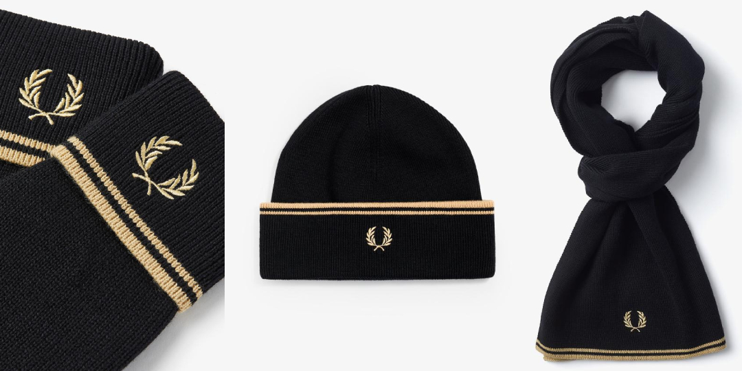 取自品牌M12N POLO衫的經典黑金配色,並應用至圍巾、毛帽、手套等保暖小物上,手套還有手指的接觸晶片設計,有型又實用保暖!