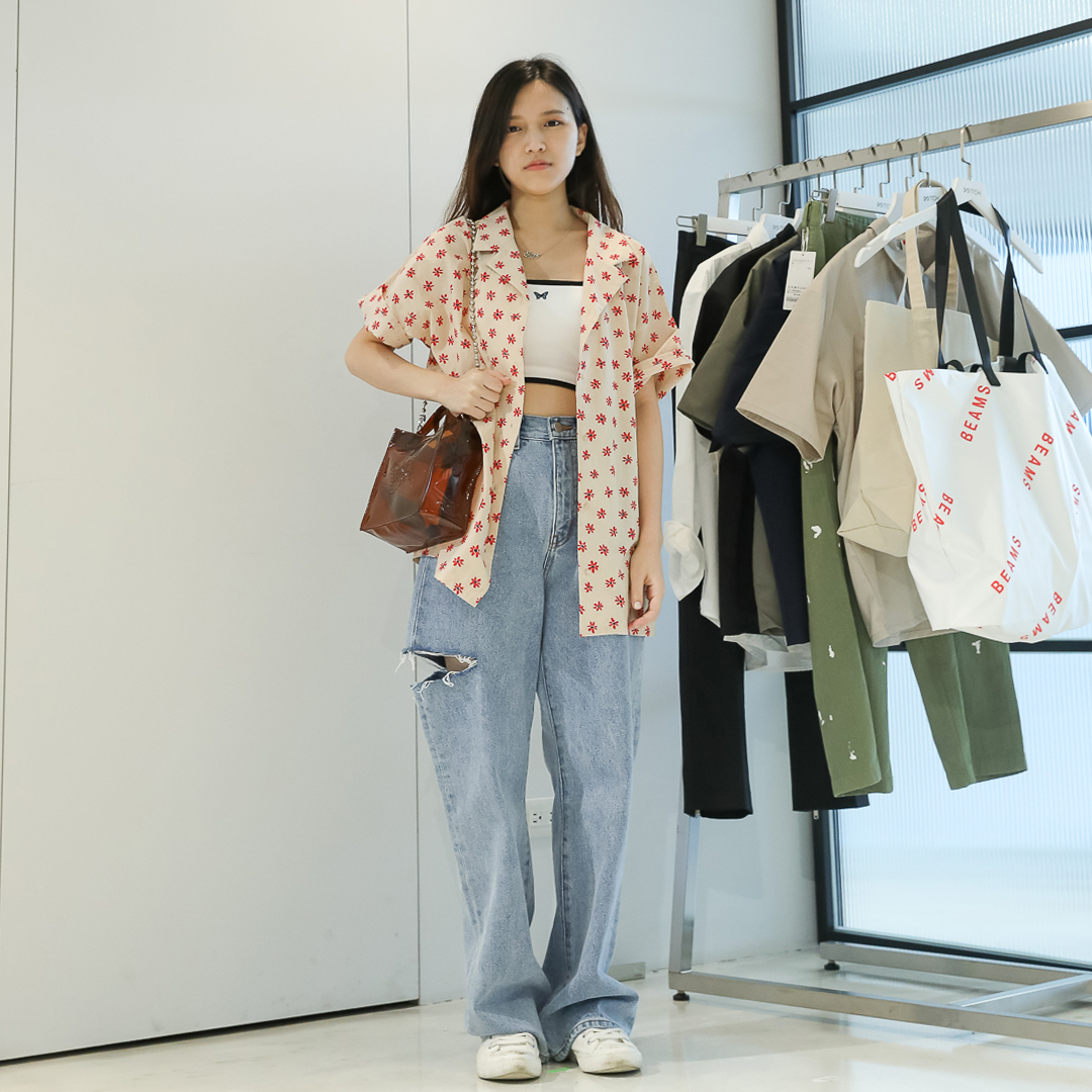 第一套選用了這件比較復古感的小花襯衫,V領設計可以搭配短項鍊,小心機露出鎖骨線條~再搭配透明的PVC包,來自WHO'S WHO gallery 的支線品牌系列"SLOPPY",可依穿搭風格選擇肩背或手提!