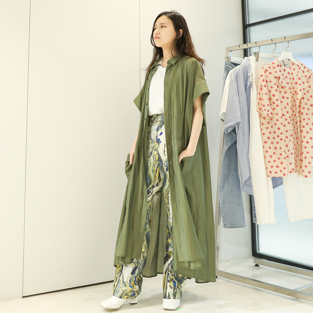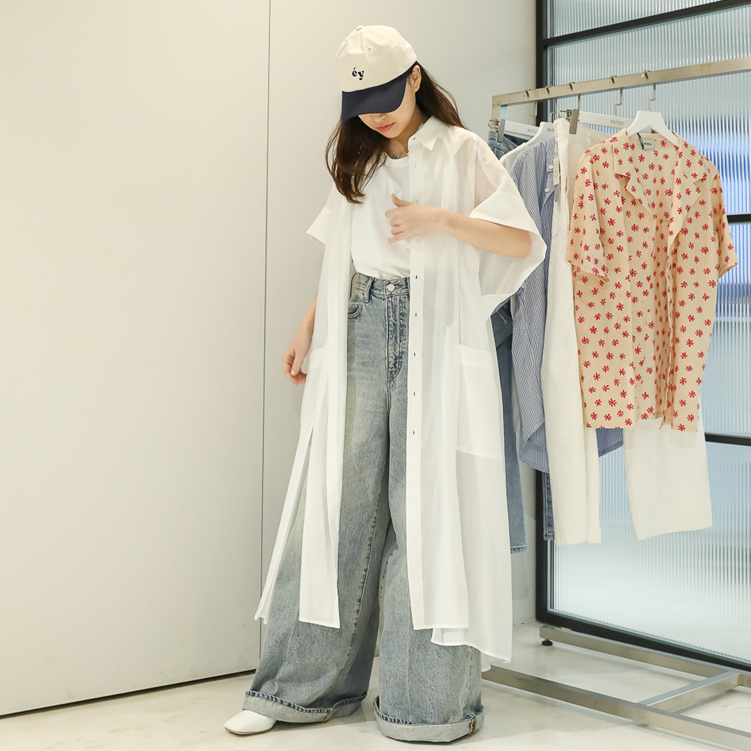 再來,中長款襯衫要跟大家介紹Ungrid這款襯衫,它是以標準領搭配誇張寬大的袖子,整體造型搭起來還是很有平衡感。下身同樣搭Ungrid長裙,透膚布料加鉤花設計日系感滿滿。另外,白色不同色系選擇工裝褲來搭配,褲管可以收緊或自然垂,換了不同下身也會帶來不同的風格感~