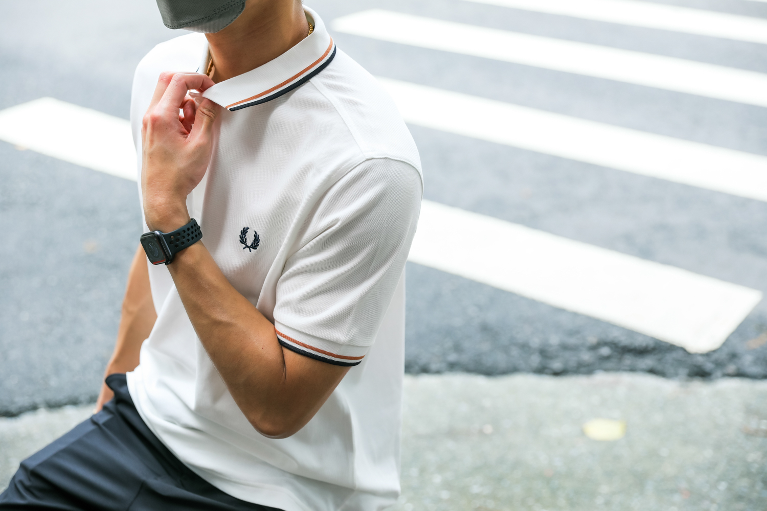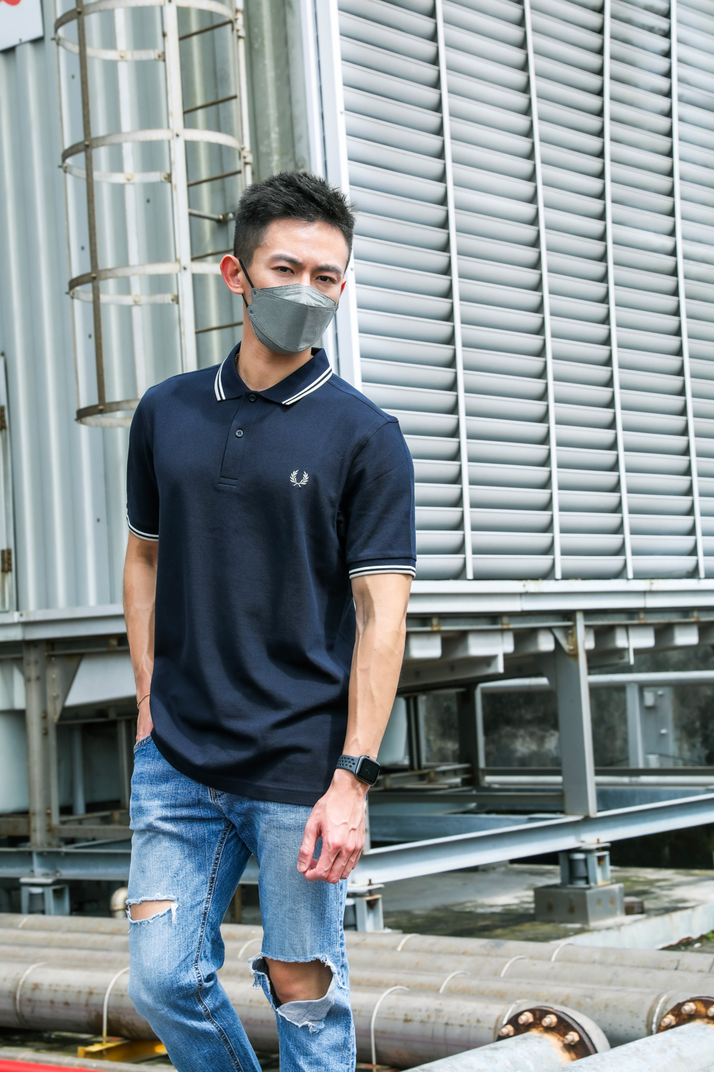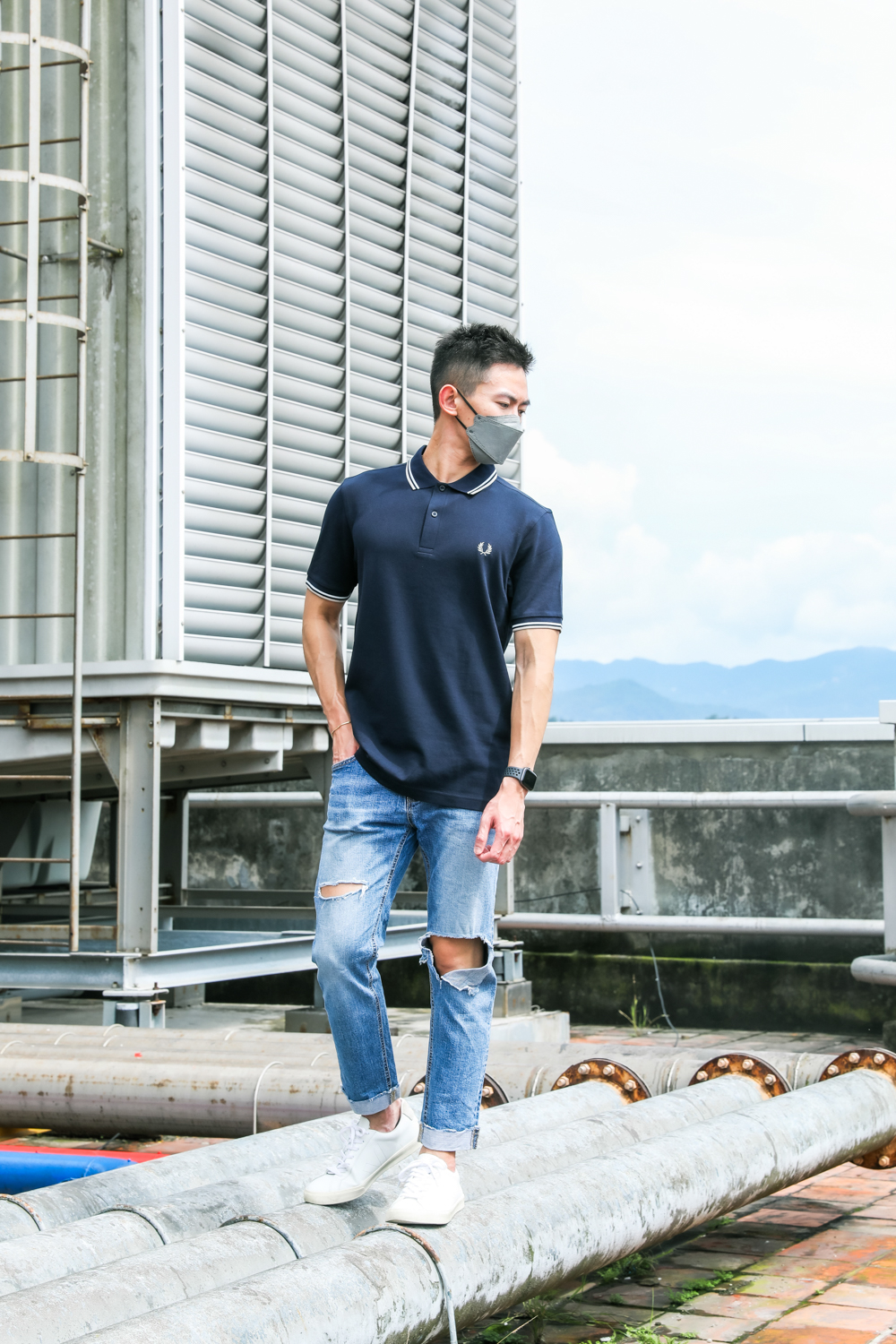 穿著FRED PERRY POLO衫的精髓就在於:扣子一定要全部扣上,才能體現出英倫紳士風範,整體更有精神!P42以海軍藍色調搭配雪白&淺褐色的雙滾邊線條,下身搭配牛仔褲或淺色系褲款皆很適合,若喜歡街頭感重一點可選擇寬鬆版型的下身!