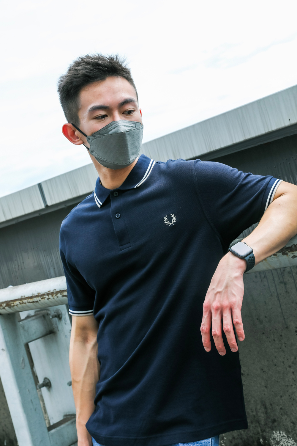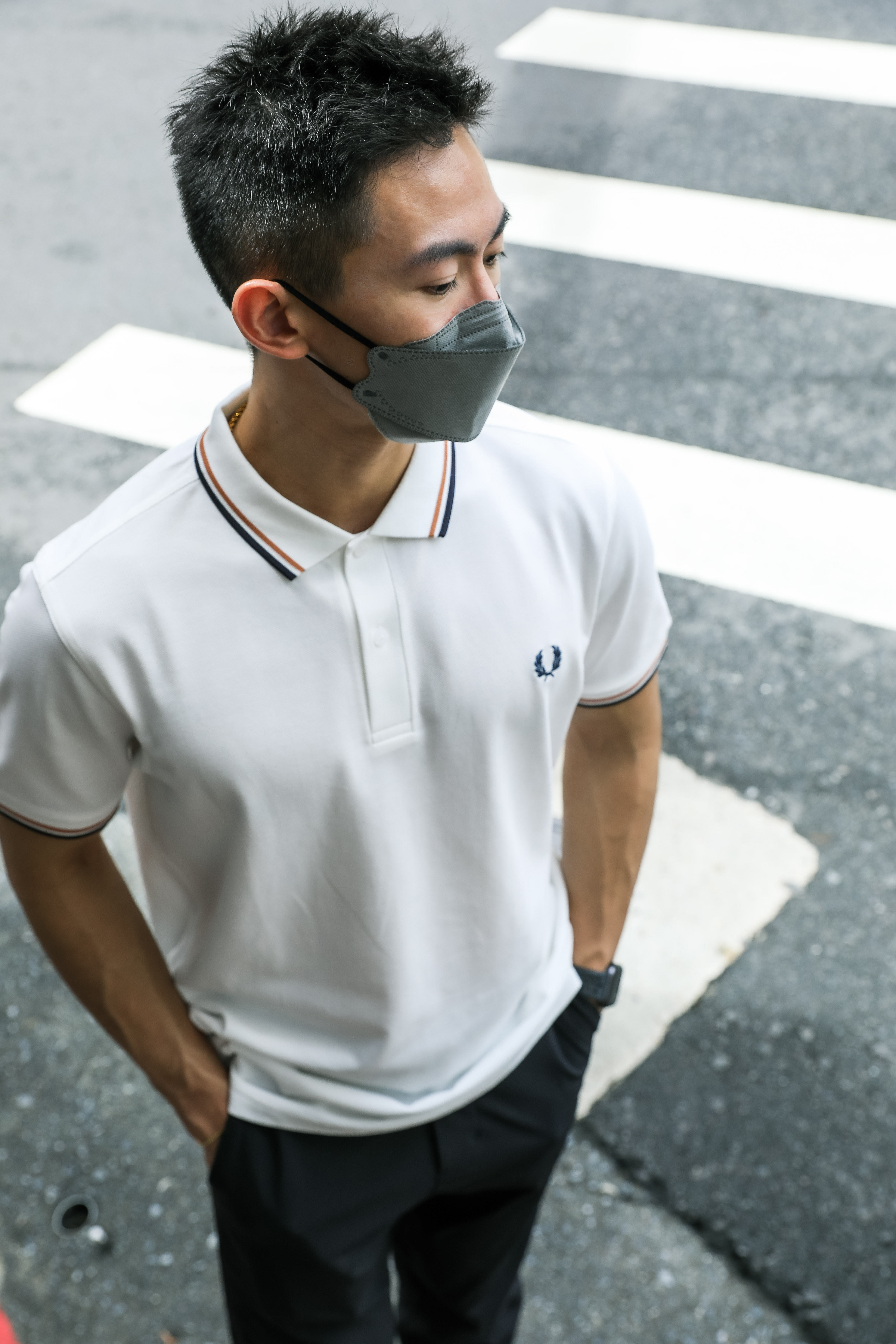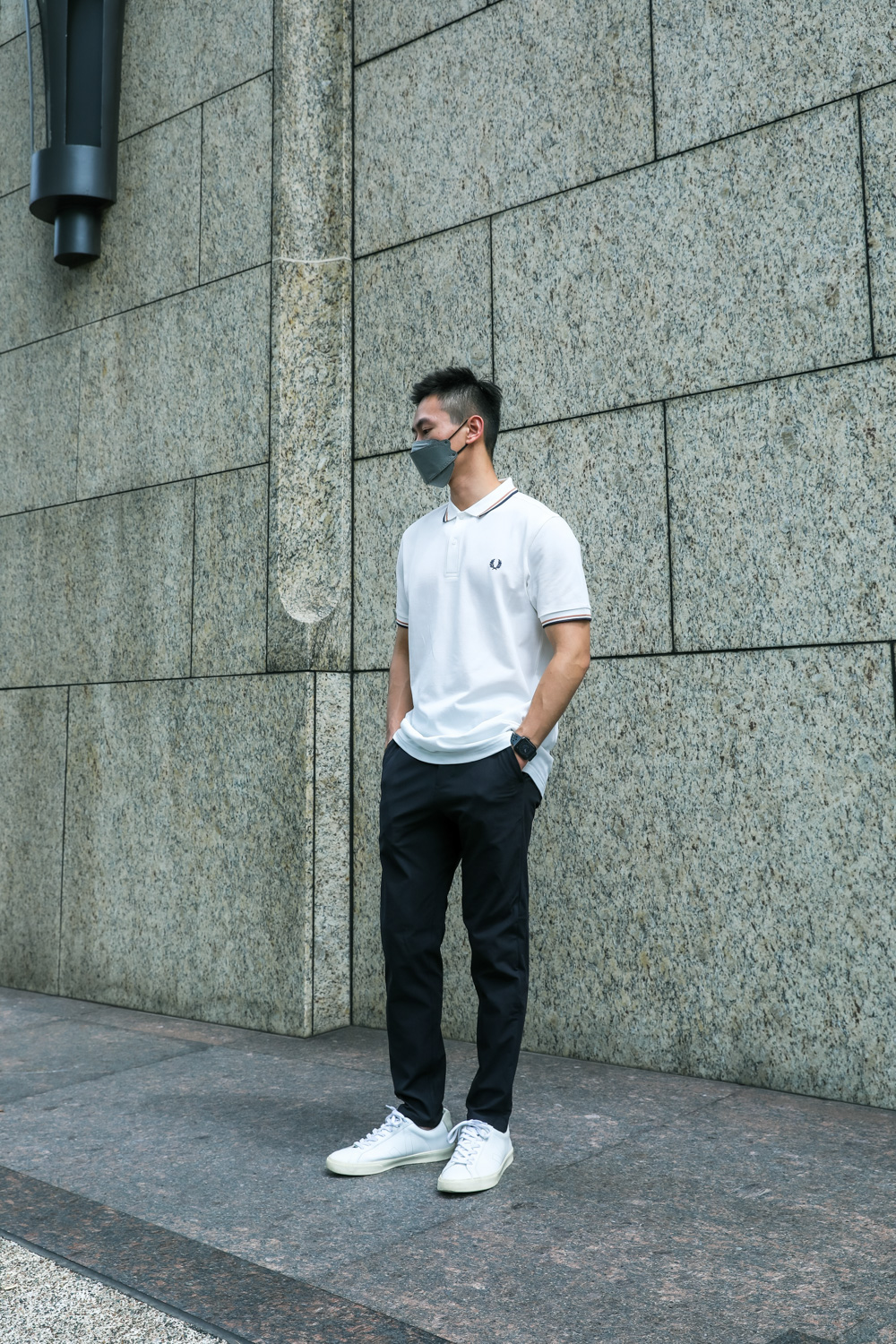 穿著FRED PERRY POLO衫的精髓就在於:扣子一定要全部扣上,才能體現出英倫紳士風範,整體更有精神!P42以海軍藍色調搭配雪白&淺褐色的雙滾邊線條,下身搭配牛仔褲或淺色系褲款皆很適合,若喜歡街頭感重一點可選擇寬鬆版型的下身!