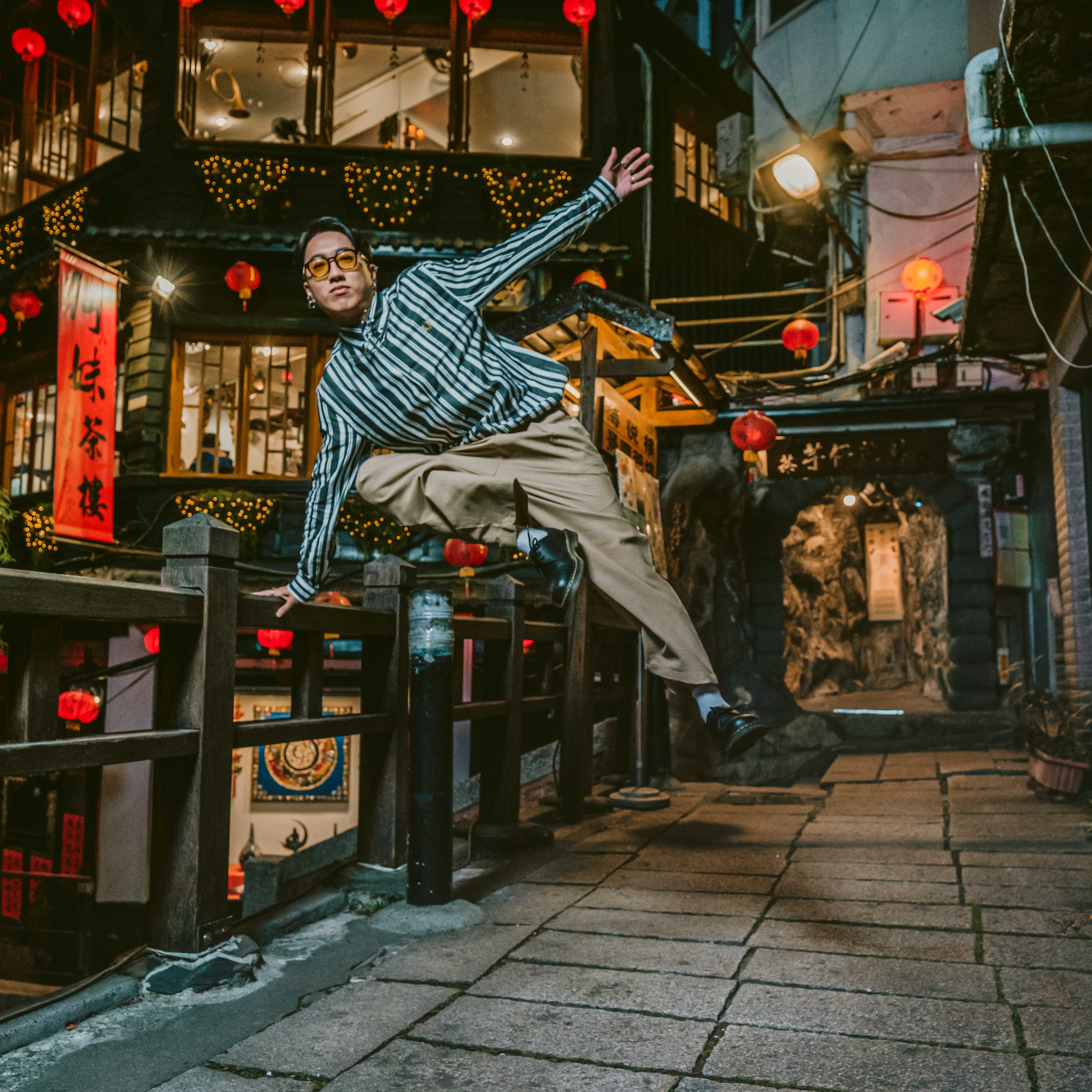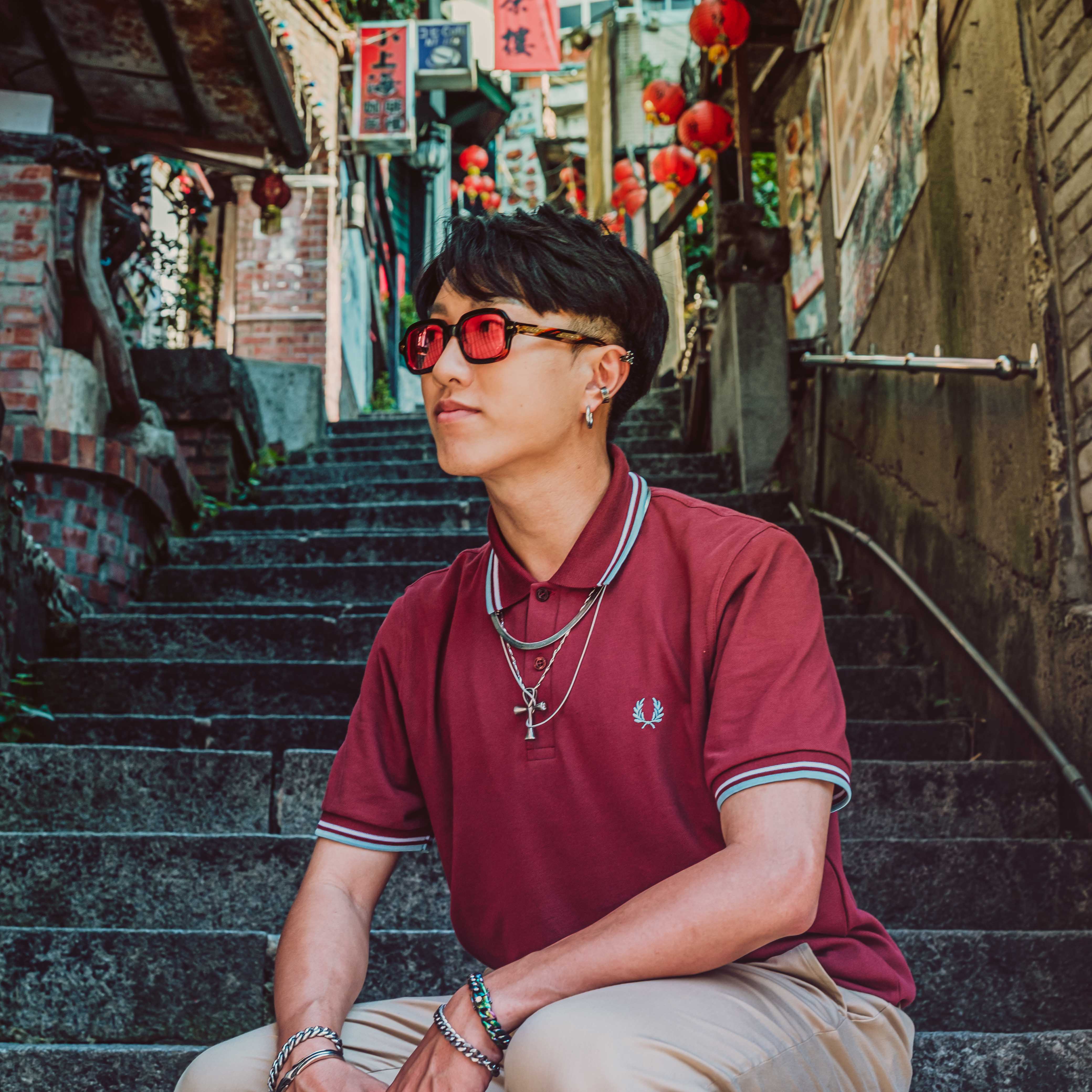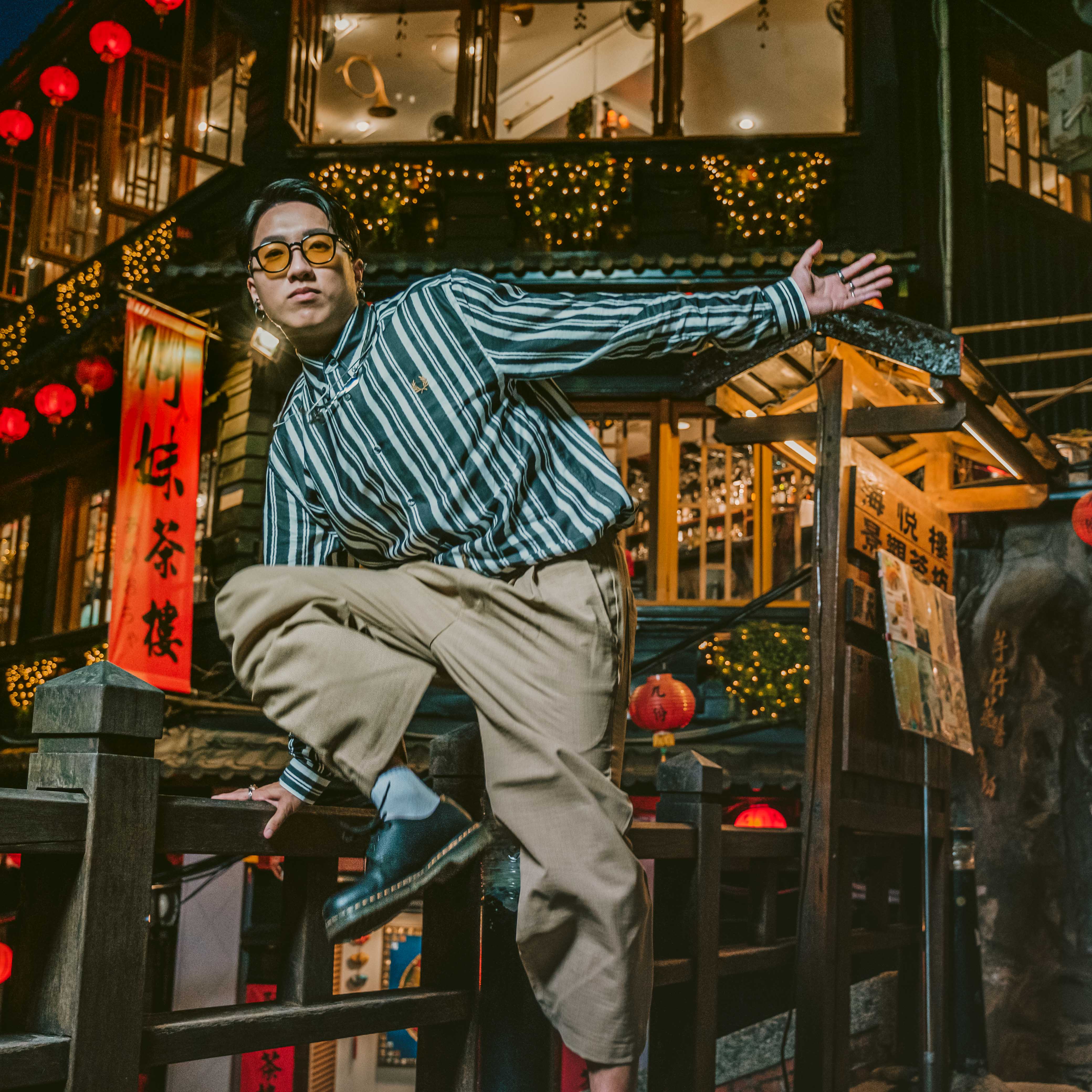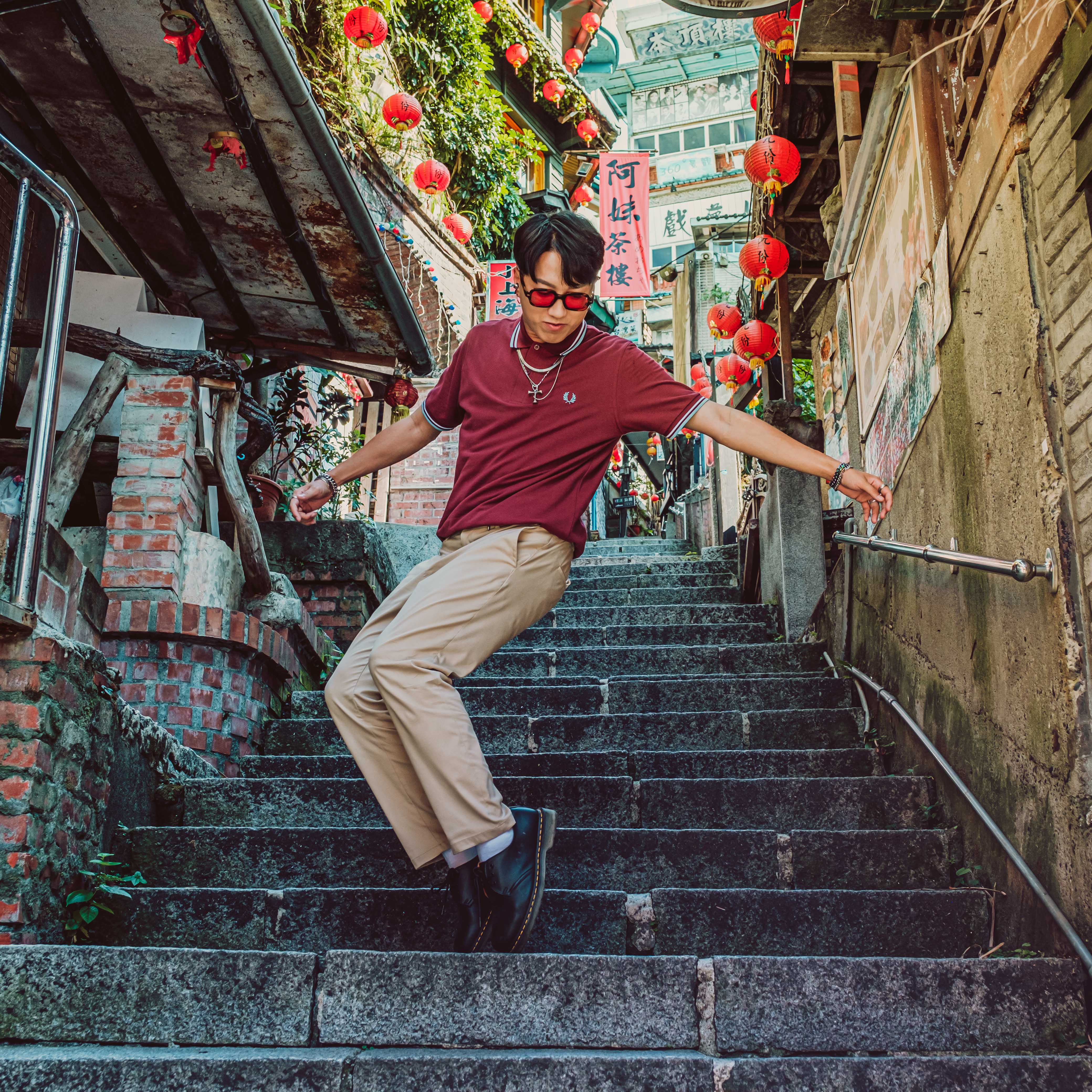 燈籠亮起,夜晚的九份又是完全不一樣的風格,取景古色古香的阿妹茶樓,充滿台式風情及懷舊氛圍!英倫復古的直條紋襯衫,經典的釦領設計,再搭配日系寬鬆長褲,獨特個性的紳裝造型,底蘊十足的品牌文化,熱愛跳舞的自由靈魂,FRED PERRY作為永恆經典總是能讓你與眾不同。