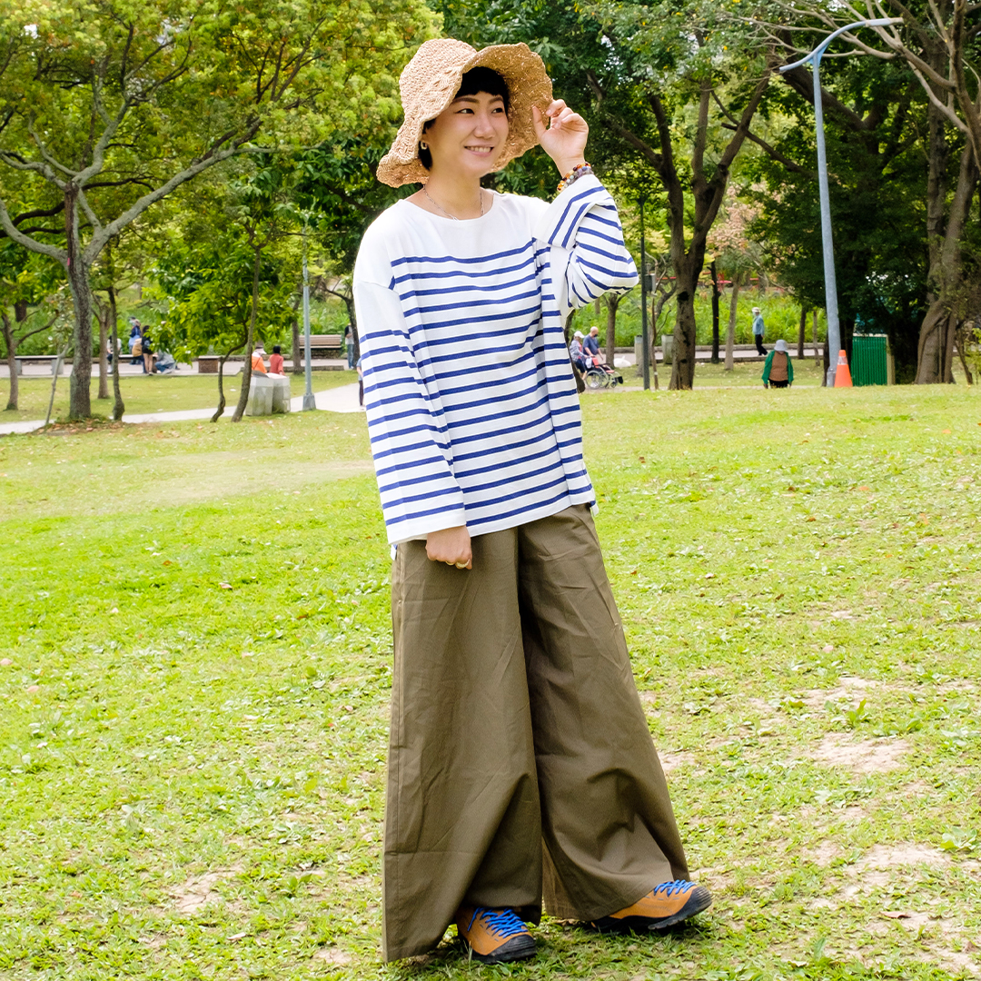 海軍藍橫條紋配上軍綠寬褲,經典又活潑,再搭配一頂草帽,營造滿滿的春天感!
