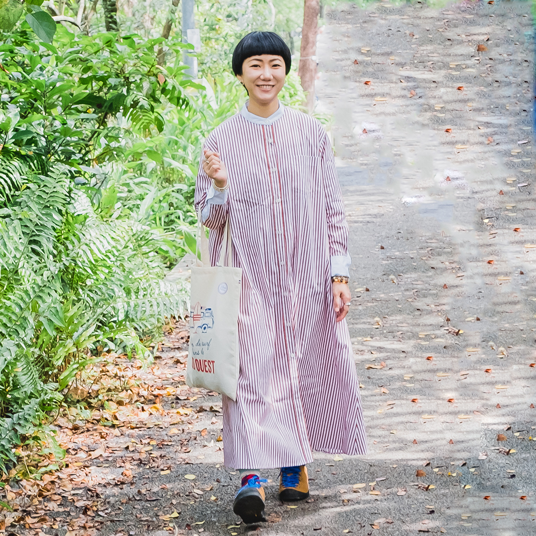 連身洋裝毫無疑問就是春季定番!紅色直條紋則更顯俏皮可愛,加上米白帆布提袋更添休閒感~
