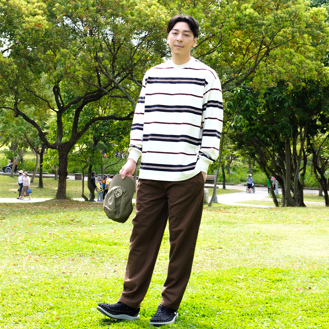 整體造型以棕色系為主軸,上衣的橫條紋為整體帶出亮點,再搭配一頂老帽,輕鬆營造美式休閒感。
