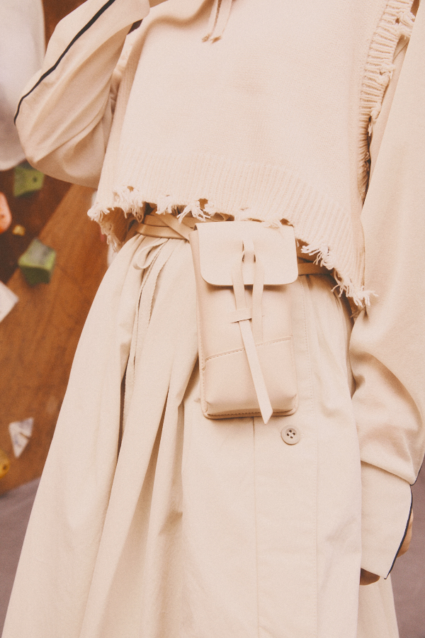 腰間的皮質小包讓同色調搭配更顯層次與細節。