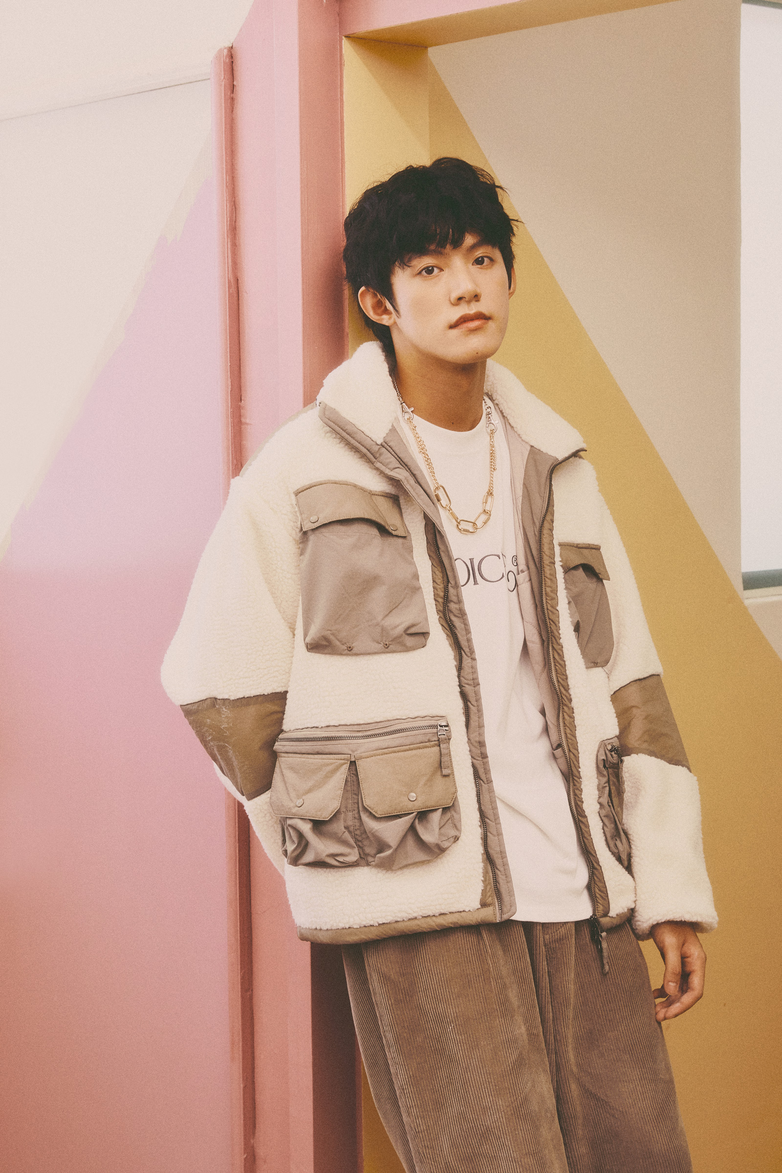 杰恩這套選用NOICE羊羔毛立領外套,機能布料與仿羊羔毛,搭配多口袋設計,讓秋冬穿搭兼具時尚與機能。