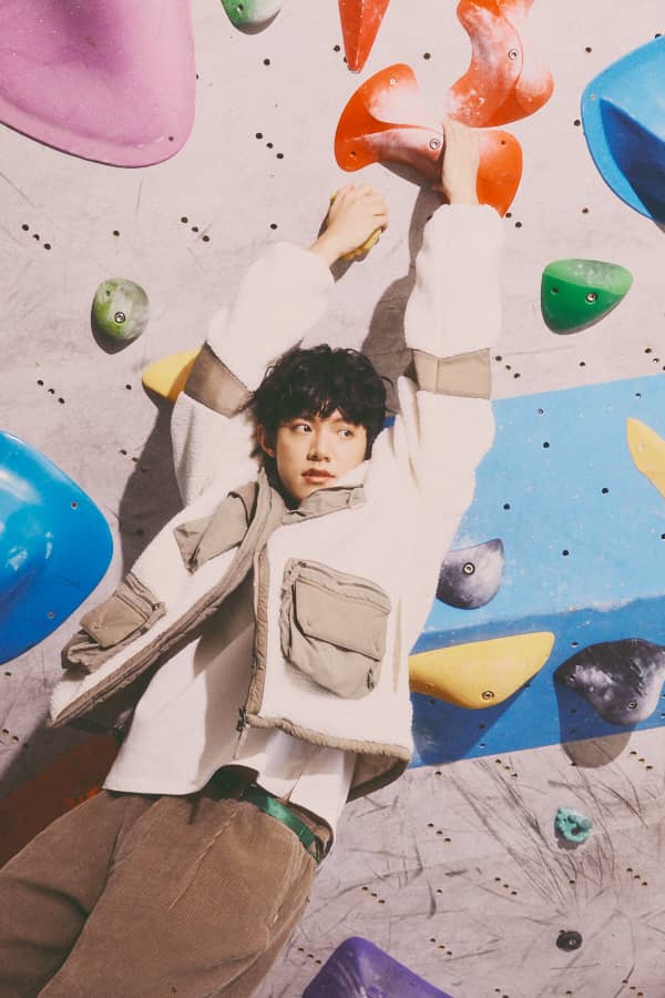 秋季是室內外活動都適合的季節,除了攀岩場景,室內更衣室的低飽和色調也呼應杰恩這套帶來不同氛圍。