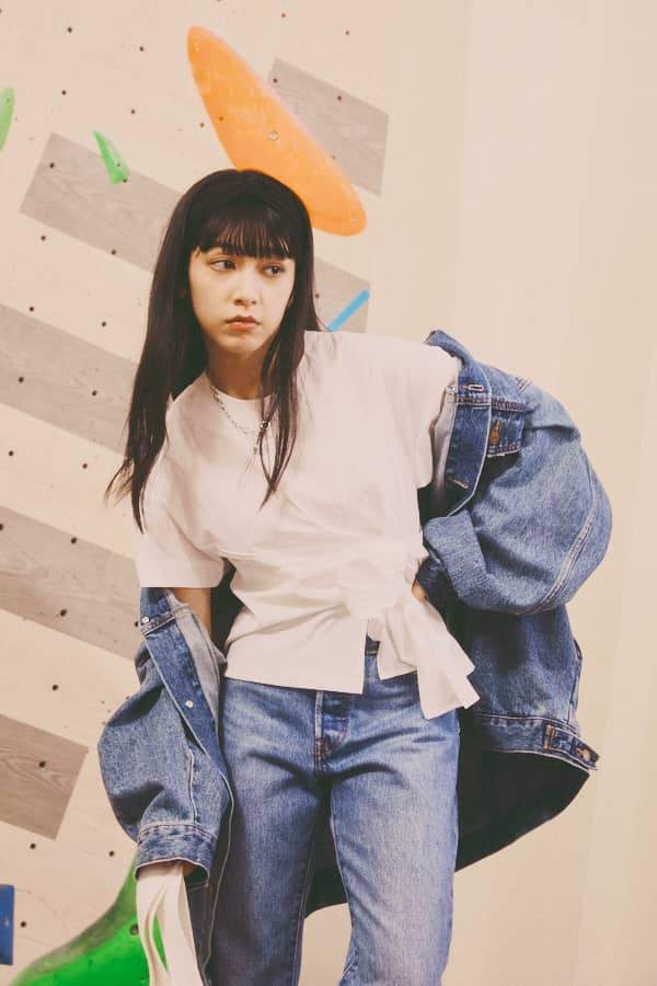 其中下身更是著用Levi's®特別訂製款經典501丹寧褲。高腰剪裁搭配直筒版型具修飾腿部效果。褲口微刷破設計凸出獨家設計品味。