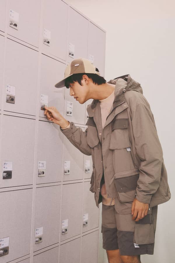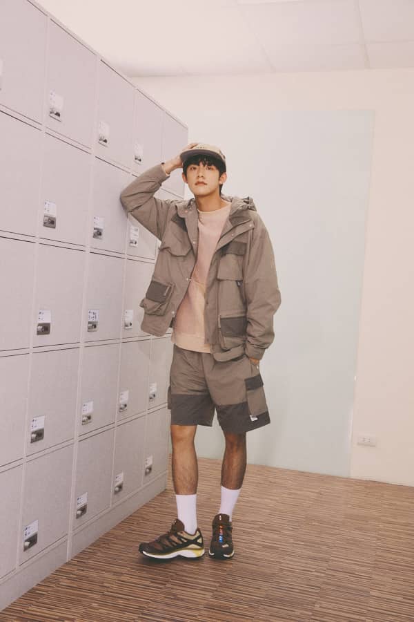 杰恩全套著用韓國品牌NOICE,多口袋連帽外套與按壓式鬆緊抽繩設計的運動短褲。