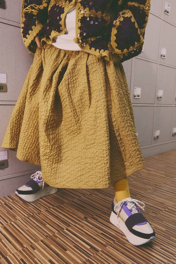 第一套Ungrid西裝外套混搭jouetie復古鉤針外套,搭配溫暖的薑黃色緹花褶皺長裙,讓秋季色彩立即套上鮮活濾鏡