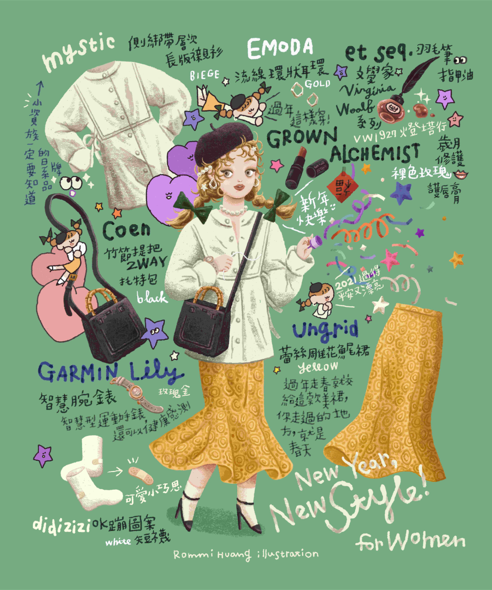 本次邀請到插畫家— 黃芝毓Rommi Huang,過去曾和蔡依林、曲家瑞等知名人士合作,其插畫也出現在711的 CITY CAFE 杯身上!或許是服裝專業背景,Rommi 在服裝細節上描繪的非常精緻,現在就用插畫的角度欣賞 MiTCH 選品吧!