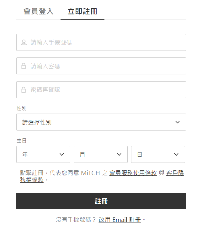 先點擊註冊成為MiTCH會員,可選擇以「手機號碼」或是「Email」為註冊帳號。