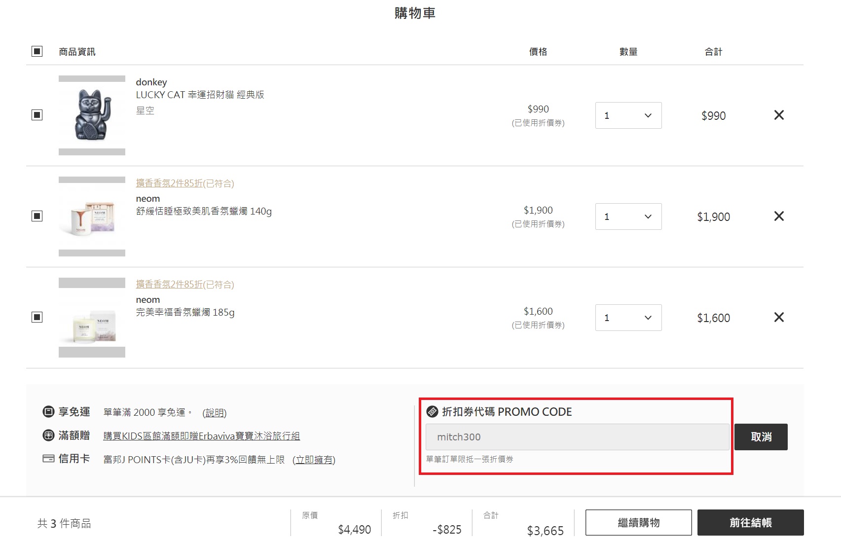於下圖結帳畫面的「折扣券代碼」紅框欄位,輸入一組最優惠的折扣碼,確認使用後前往結帳,即成功下單!