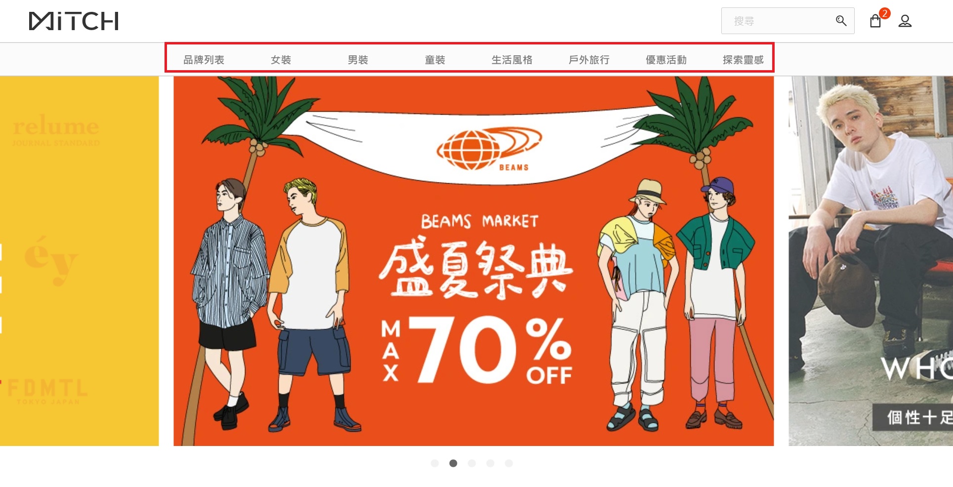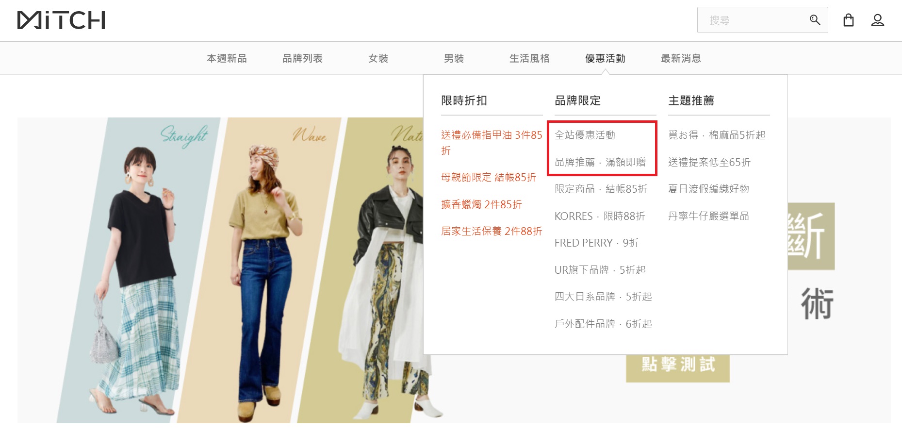 從menu選單篩選類別,可以從「品牌列表」挑選喜歡或有興趣的新品或品牌開始逛起,或是從「男/女/童裝」、「生活風格」、亦或是「優惠活動」等分類,依照個人使用習慣選擇。