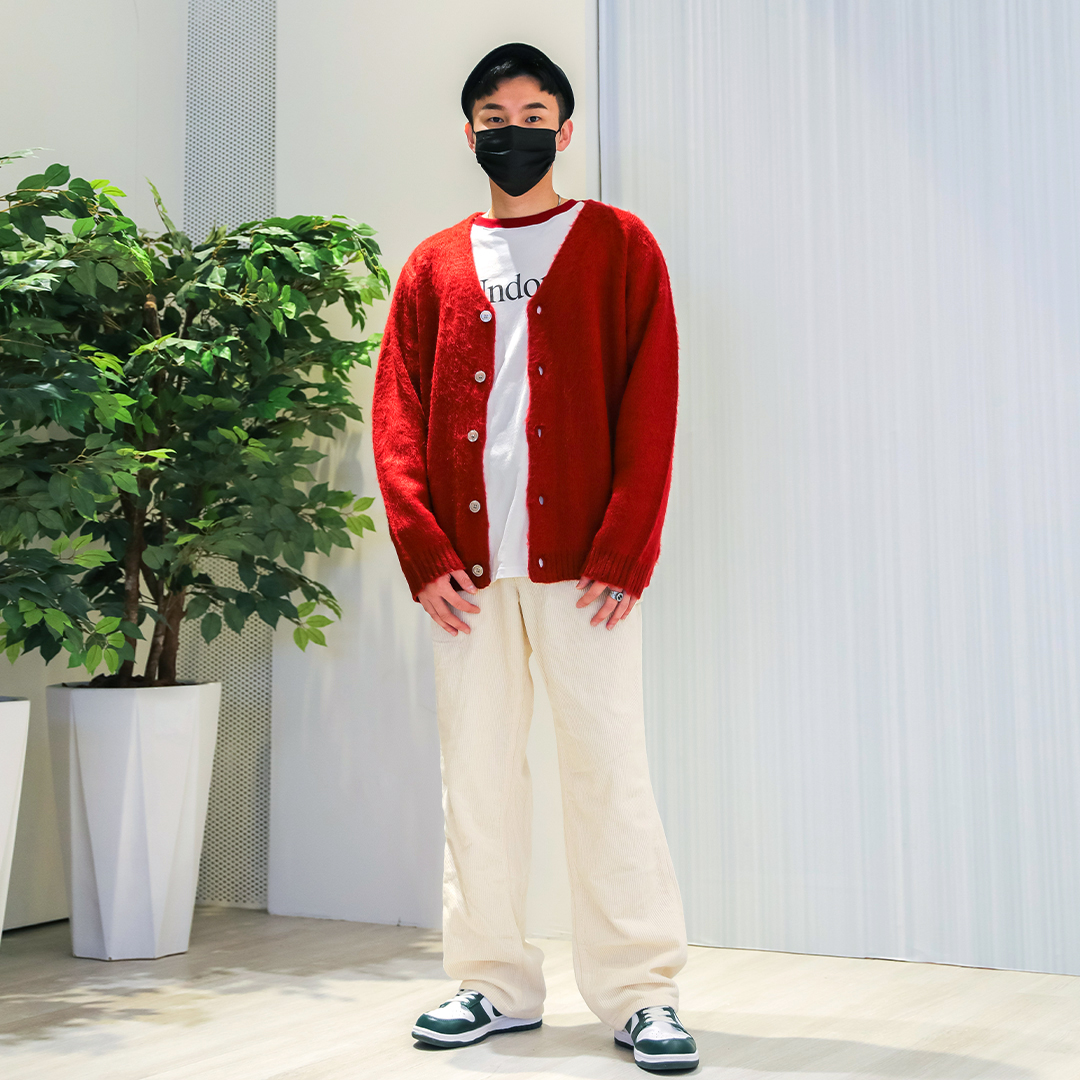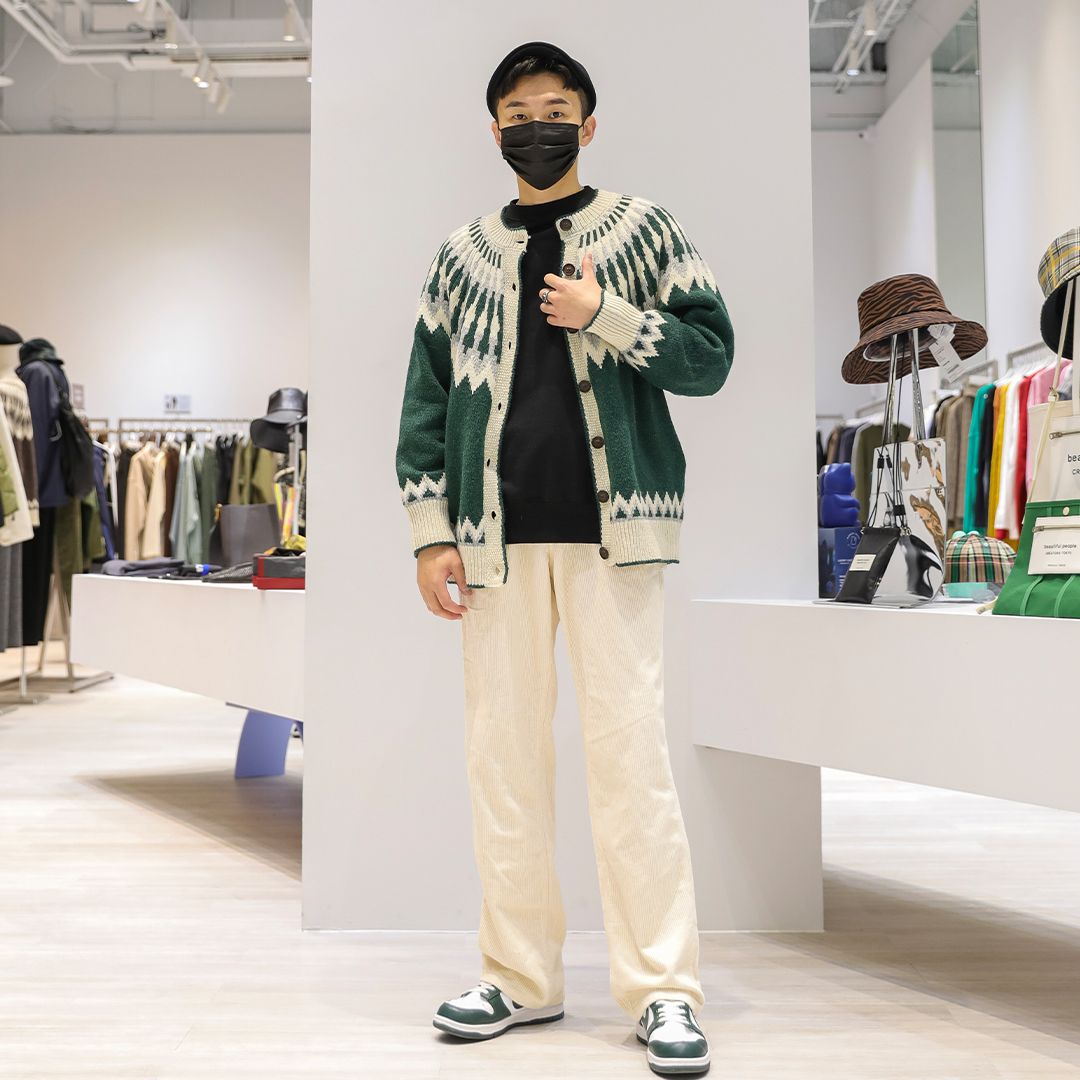 HsinNan第一套就以經典綠色單品做搭配,而冬季的搭配除了基本的配色之外,材質也是值得嘗試的地方。這套的上身就以天冷必備的針織開襟衫來做搭配,單品上的北歐圖騰也非常有冬季感!下身則使用燈芯絨材質的褲款,不管是外觀或著用起來都十分保暖。