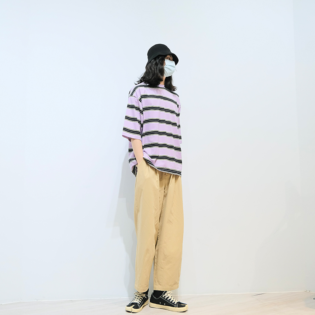 最後一套配色採用鮮艷的色調增加活潑感,以紫色為基底打造搶眼風格。褲款著用LOOK1出現過的寬版錐形褲,並且為了營造較清爽的感覺,選用了較淺的膚色配色。