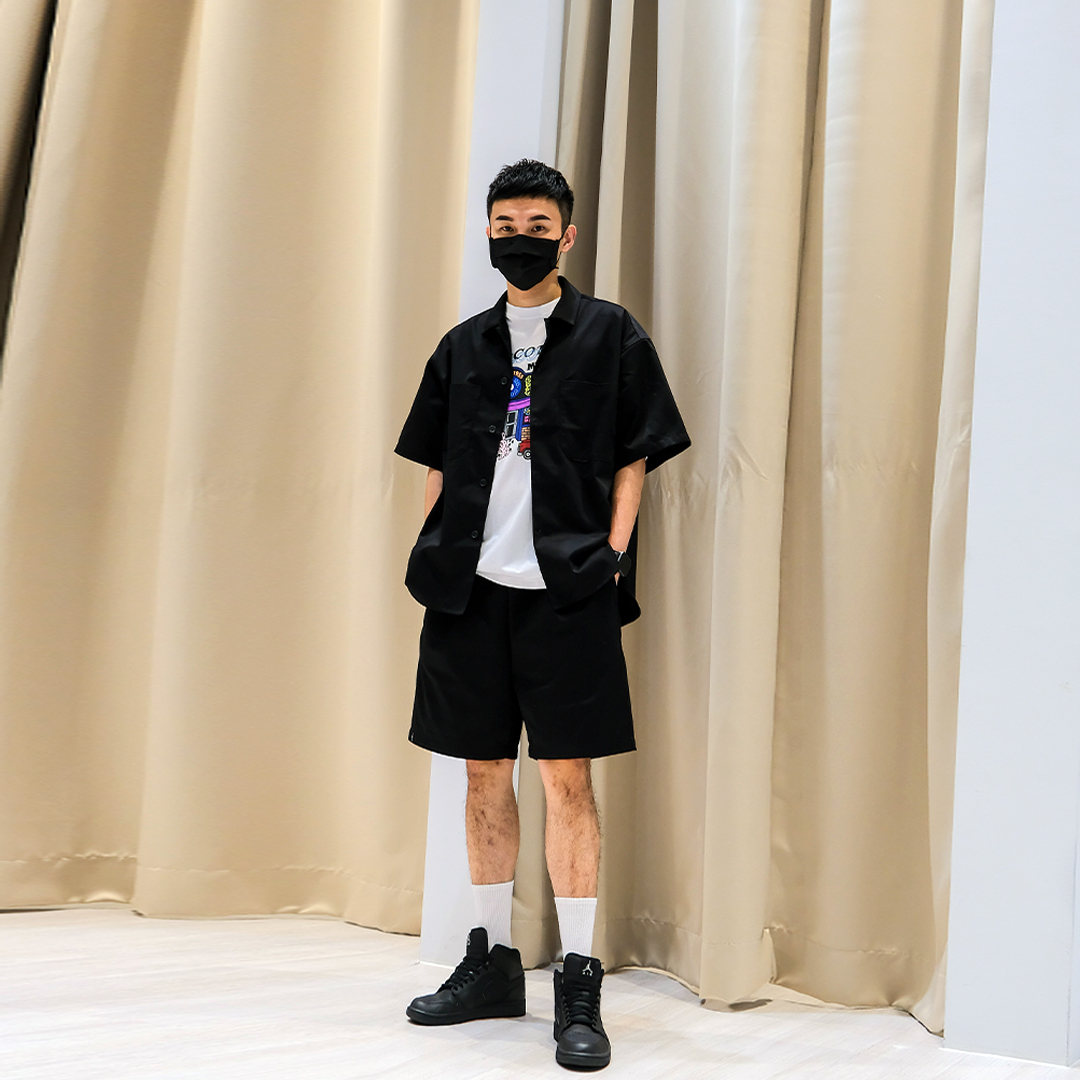 襯衫除了短版、全扣之外,HsinNan這套直接罩在外面,並利用上衣的漫畫圖案當作整體搭配的重點。使用全黑套裝之餘,襪子與上衣也利用顯眼的白色跳脫出來,整體看起來更有層次而且簡潔俐落!
