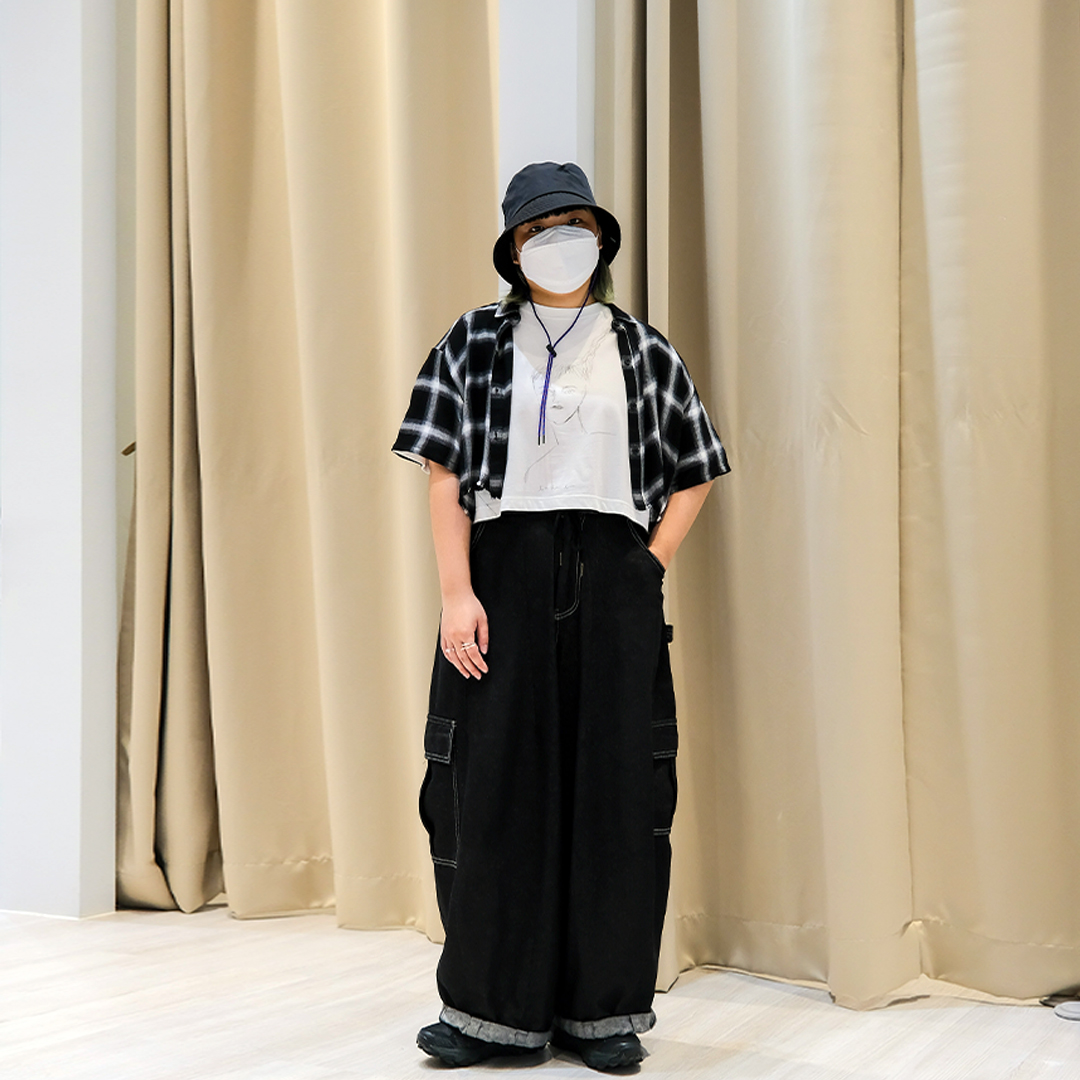 Amber這套以黑色系穿搭為主,並利用各種單品的細節增加豐富度,例如襯衫的抽鬚做工、牛仔寬褲的明線車縫、帽款的跳色綁繩以及極具個人風格感的手飾都讓黑色系穿搭不單調!