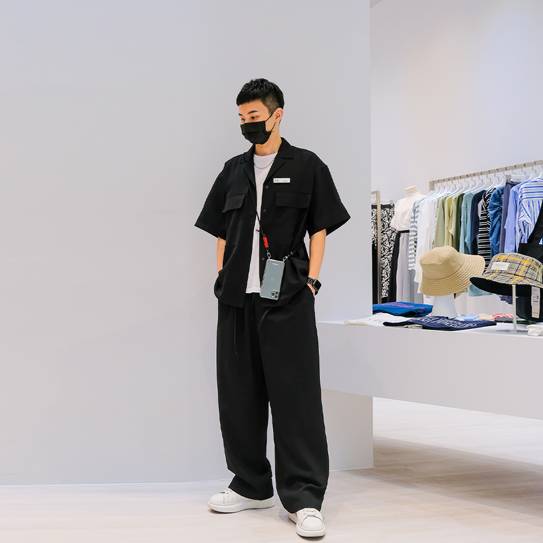 HsinNan利用了套裝單品維持了一致性與搭配性,再將套裝襯衫打開讓白T恤與白鞋上下呼應增加層次感。細節配件上則使用了背帶手機殼,讓整體穿搭有更多元素加入更有可看性!