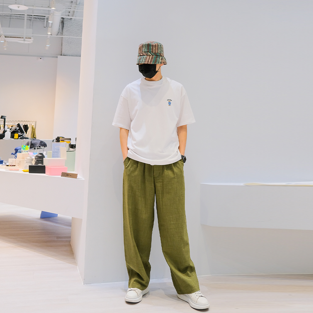 白T恤上的小LOGO也是必須的,畢竟單穿上衣還是需要一些亮點點綴,才不會使得整體太過單調唷!褲款的重點在於其垂墜的版型與亞麻材質,夏天想穿長褲時最適合了