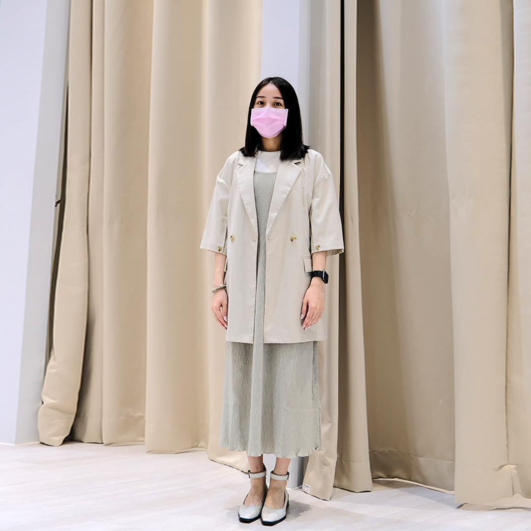 最後一套Lucy以淺色系長洋裝搭配五分袖西外打造休閒感搭配。跟第一套一樣以one tone呈現,全身單品包括鞋子都互相呼應,就算只穿著內搭的兩件FREAK'S STORE 單品也十分適合!