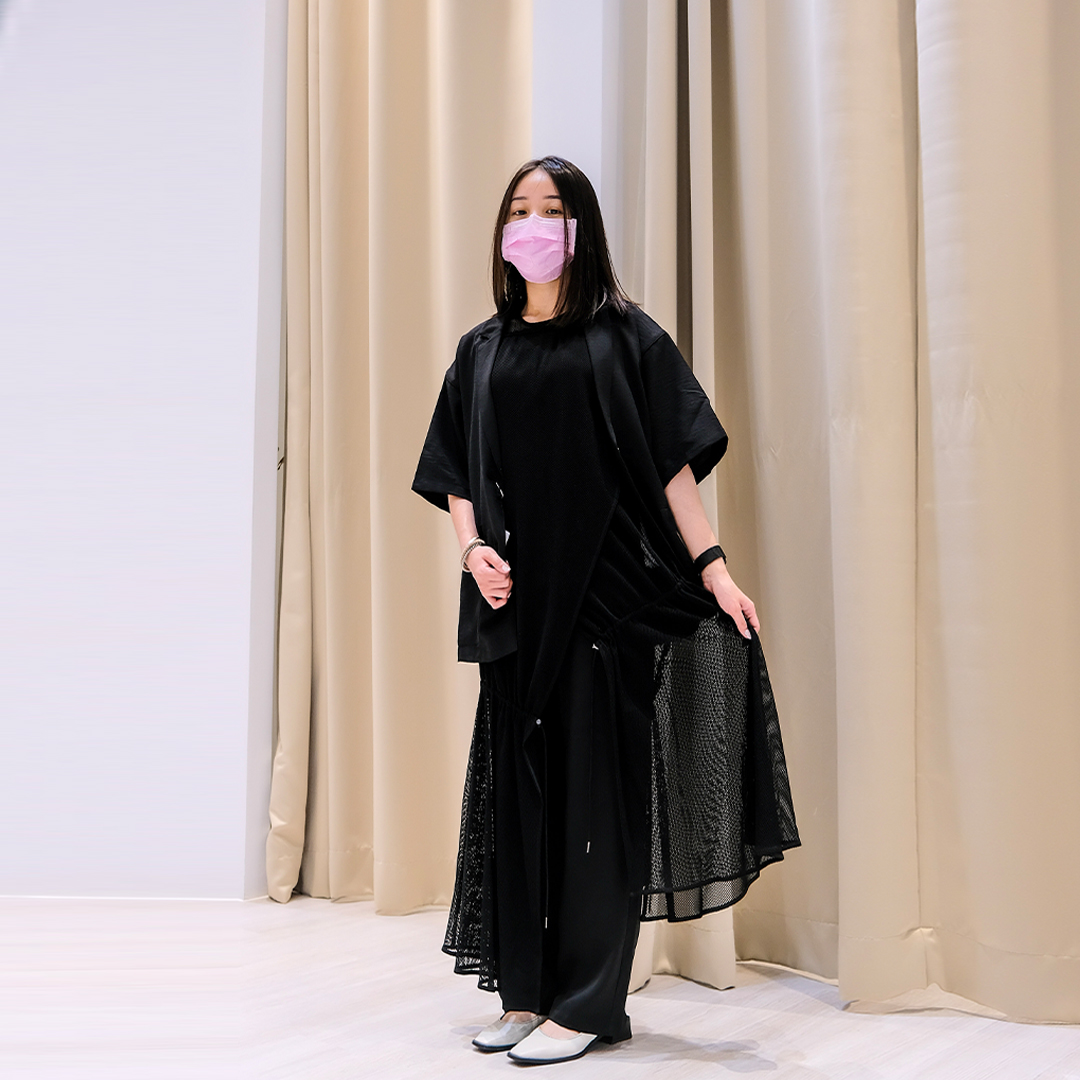 第一套Lucy雖以全黑風格搭配,但利用各種材質不同的黑色單品也能營造層次感。西裝外套材質以涼感棉麻為主,並設計成短袖樣式,適合夏末著用。內搭的網紗洋裝可塑性極高,不管單穿內搭都能靈活搭配!