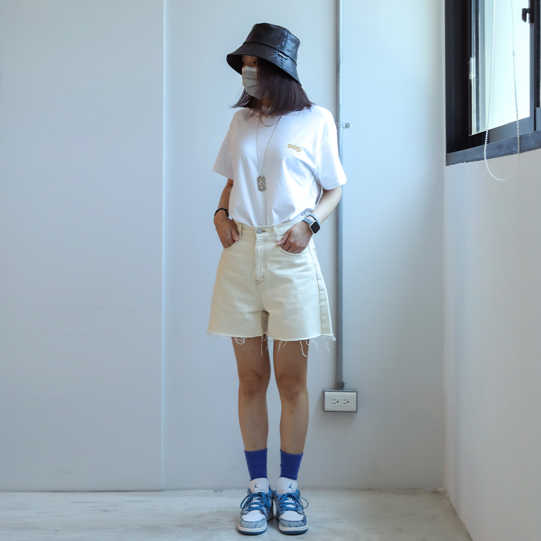 夏日到來,將白T紮進白色牛仔短褲,配上colorful的球鞋、與同色系襪子營造視覺整體感,帶來延伸效果,再搭上一頂漁夫帽,清爽又協調,還充滿青春活潑的氛圍,夏季穿搭就是這麼簡單!