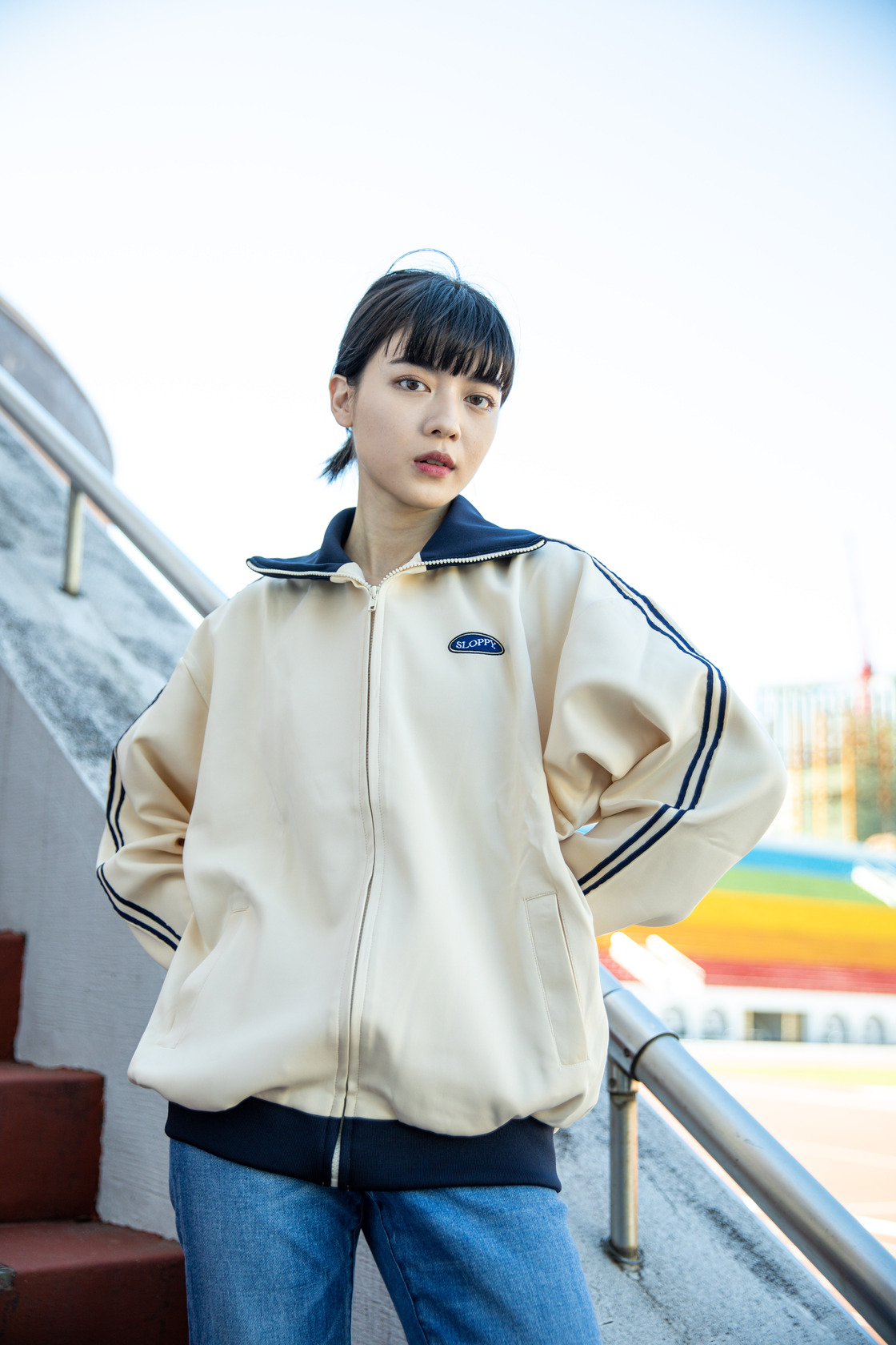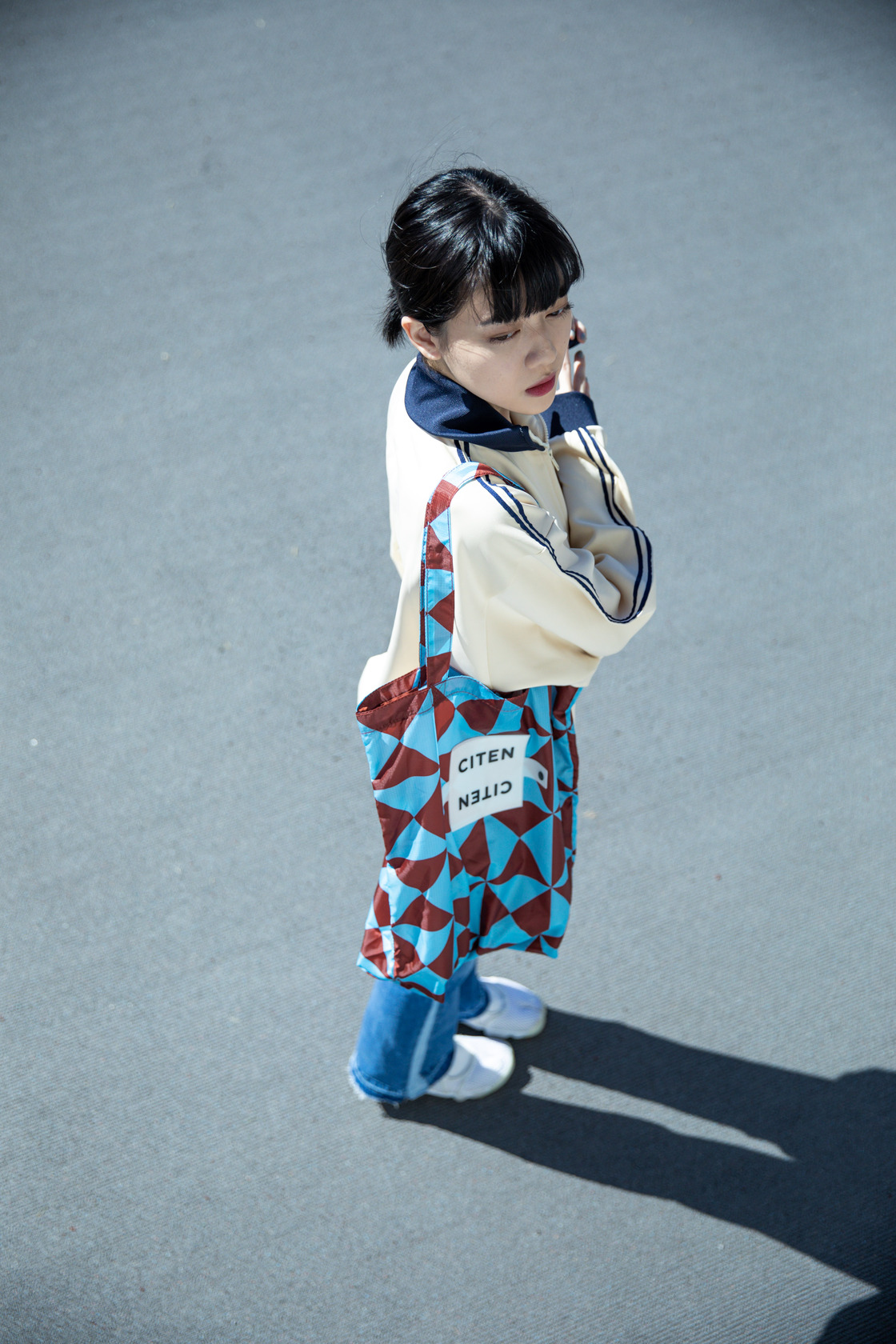 領口及下擺採撞色的運動外套,搭配有拼接小細節的牛仔褲,揹上CITEN環保托特包輕鬆出門!