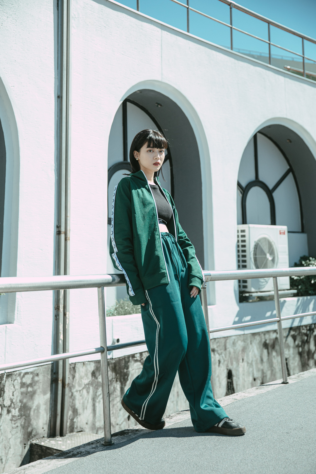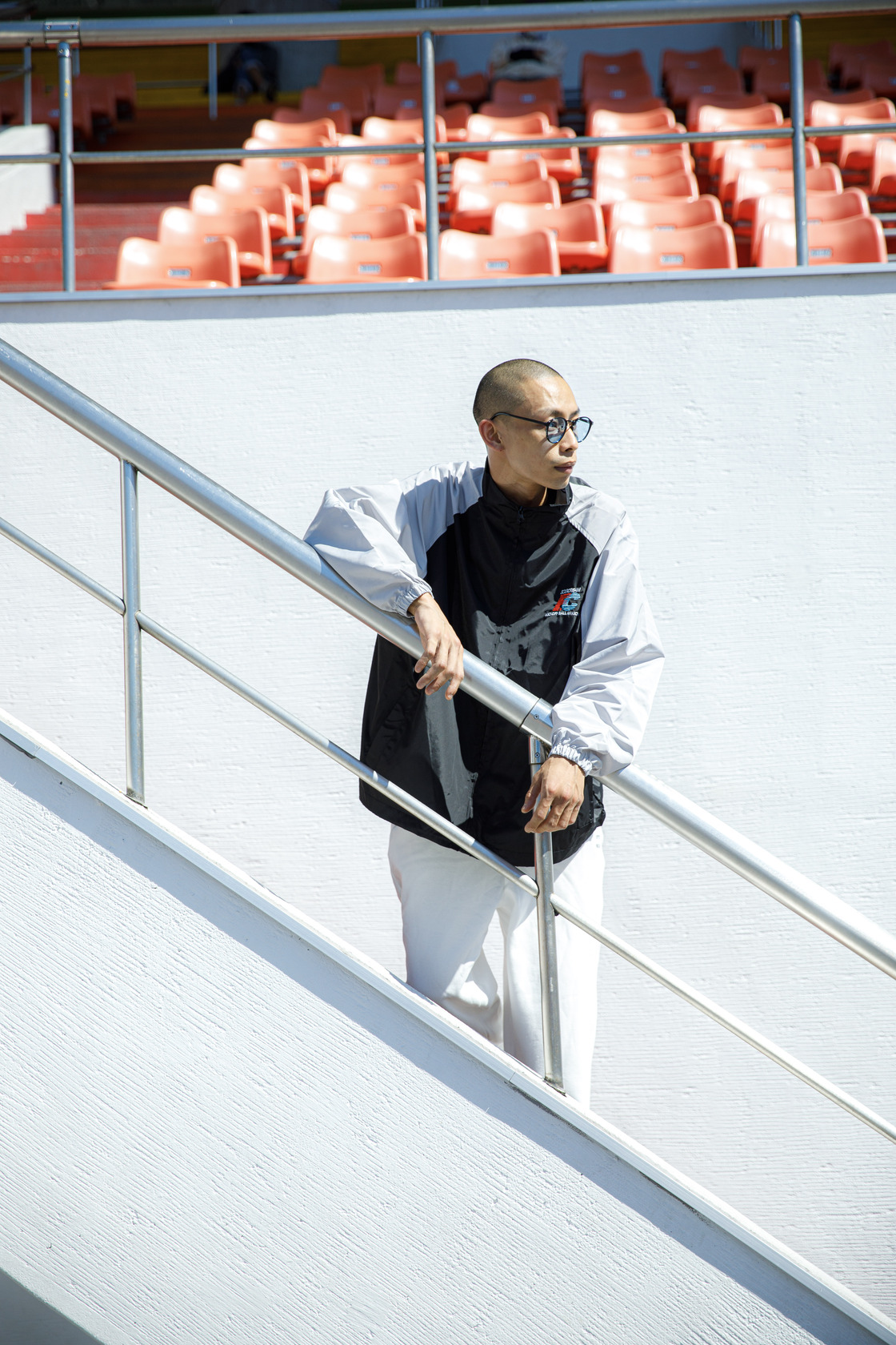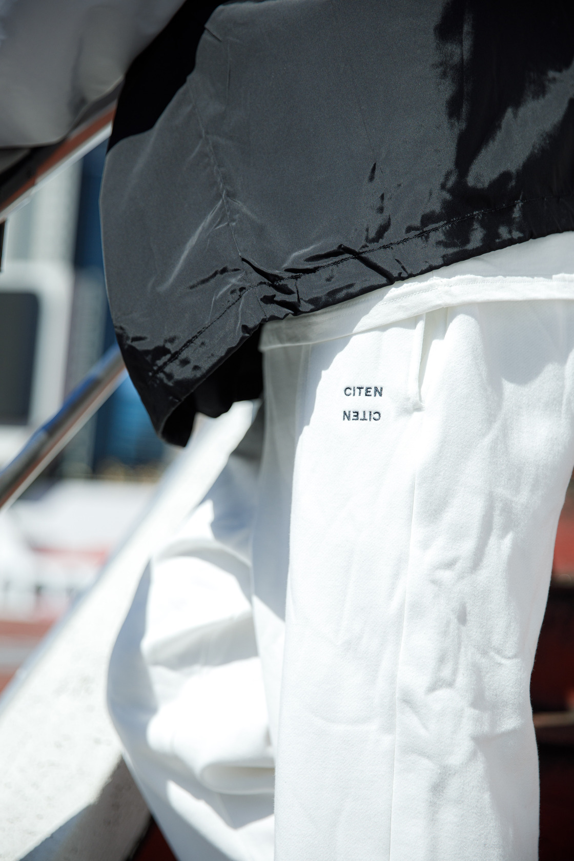 拚色的防風外套,下身著用日系品牌CITEN的運動棉褲,寬鬆版型的厚棉材質搭配刺繡LOGO,穿著舒適又有型!