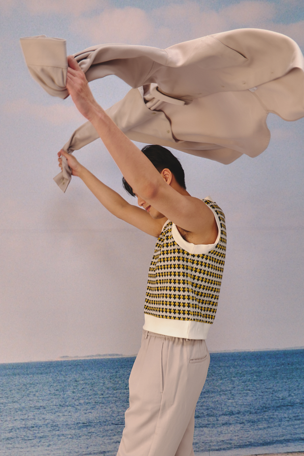 品牌服裝多見工裝、Outdoor等風格特色,並且以日系視角詮釋美式休閒,此次安俊朋把襯衫當作披肩使用,更添夏季的日系休閒感,傳遞崇尚自然不造作卻也不失個性的時尚 。