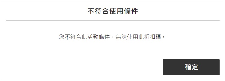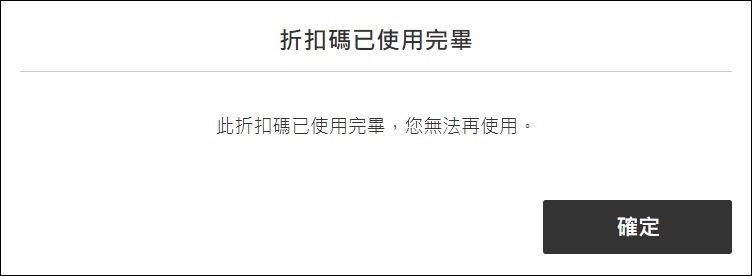 輸入折扣碼後,若出現以下畫面代表優惠碼額度數量已被使用完畢,敬請見諒!