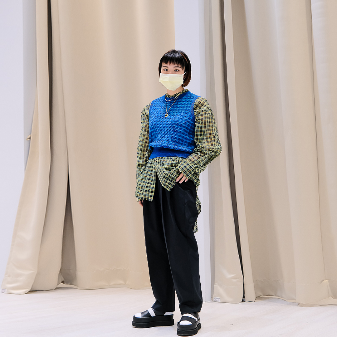 飽和度高的藍色背心與格紋襯衫,創造撞色視覺效果。