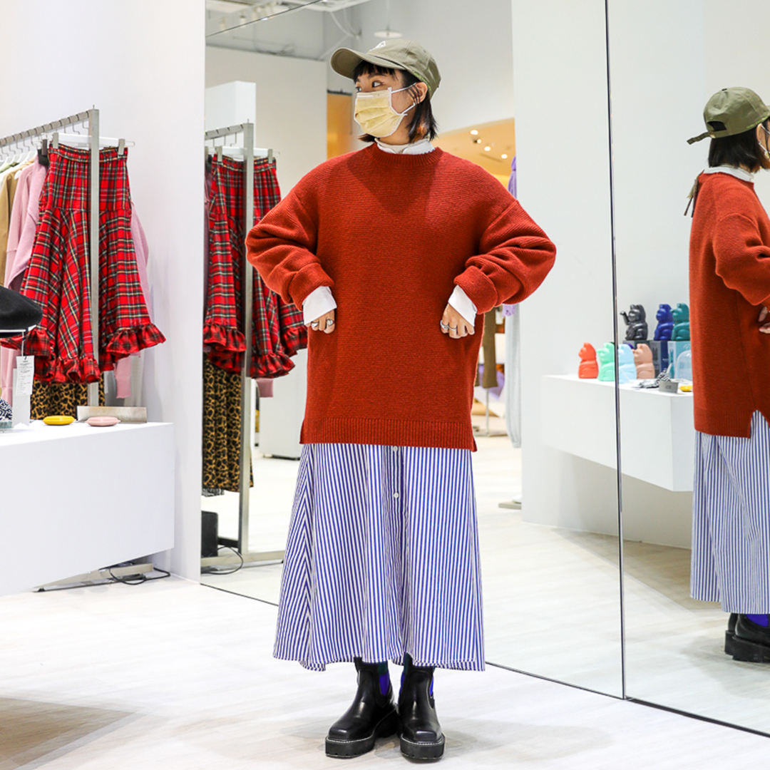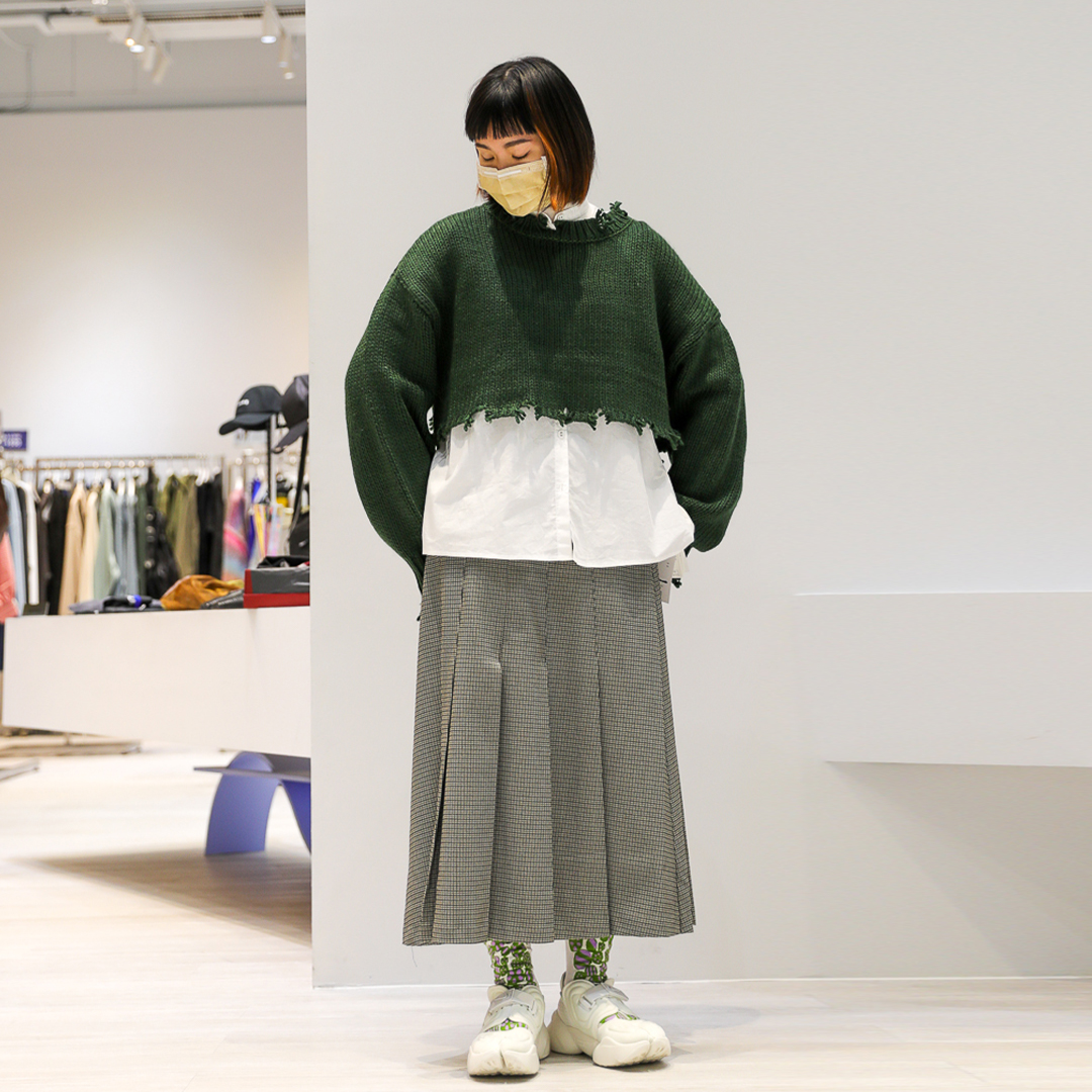 Emily運用短版針織毛衣及裙子製造良好視覺比例及層次感,針織毛衣的破壞感及長裙的千鳥格紋都讓細節更加豐富!